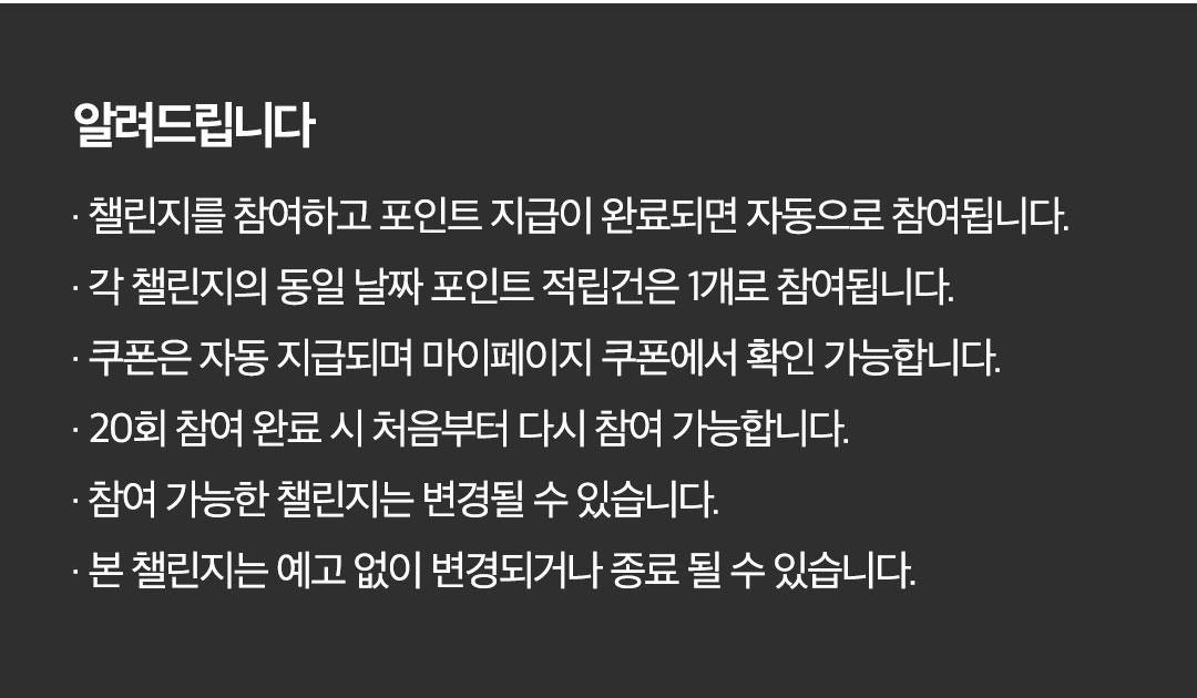 챌린지 적합도가 부족한 경우 비전시 (본인만 보임) 및 적립되지 않을 수 있습니다.