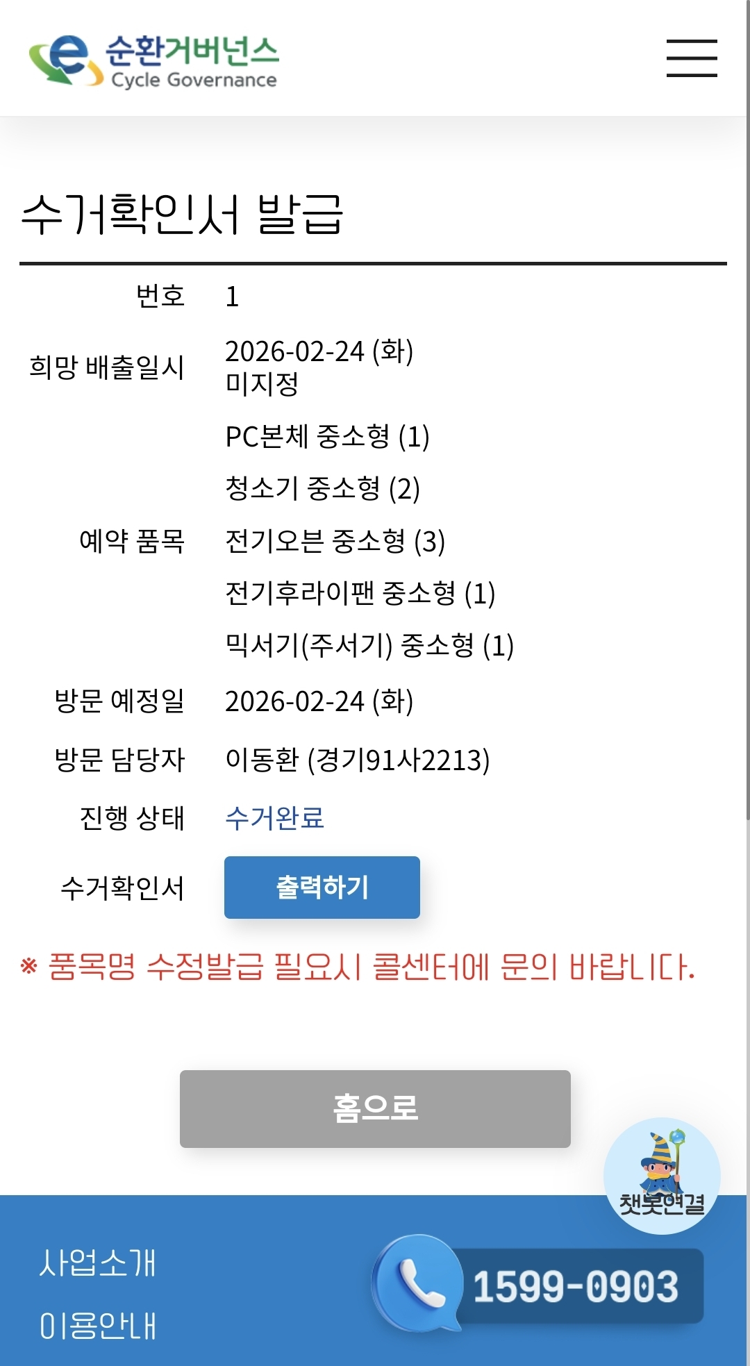 폐가전제품 수거 완료