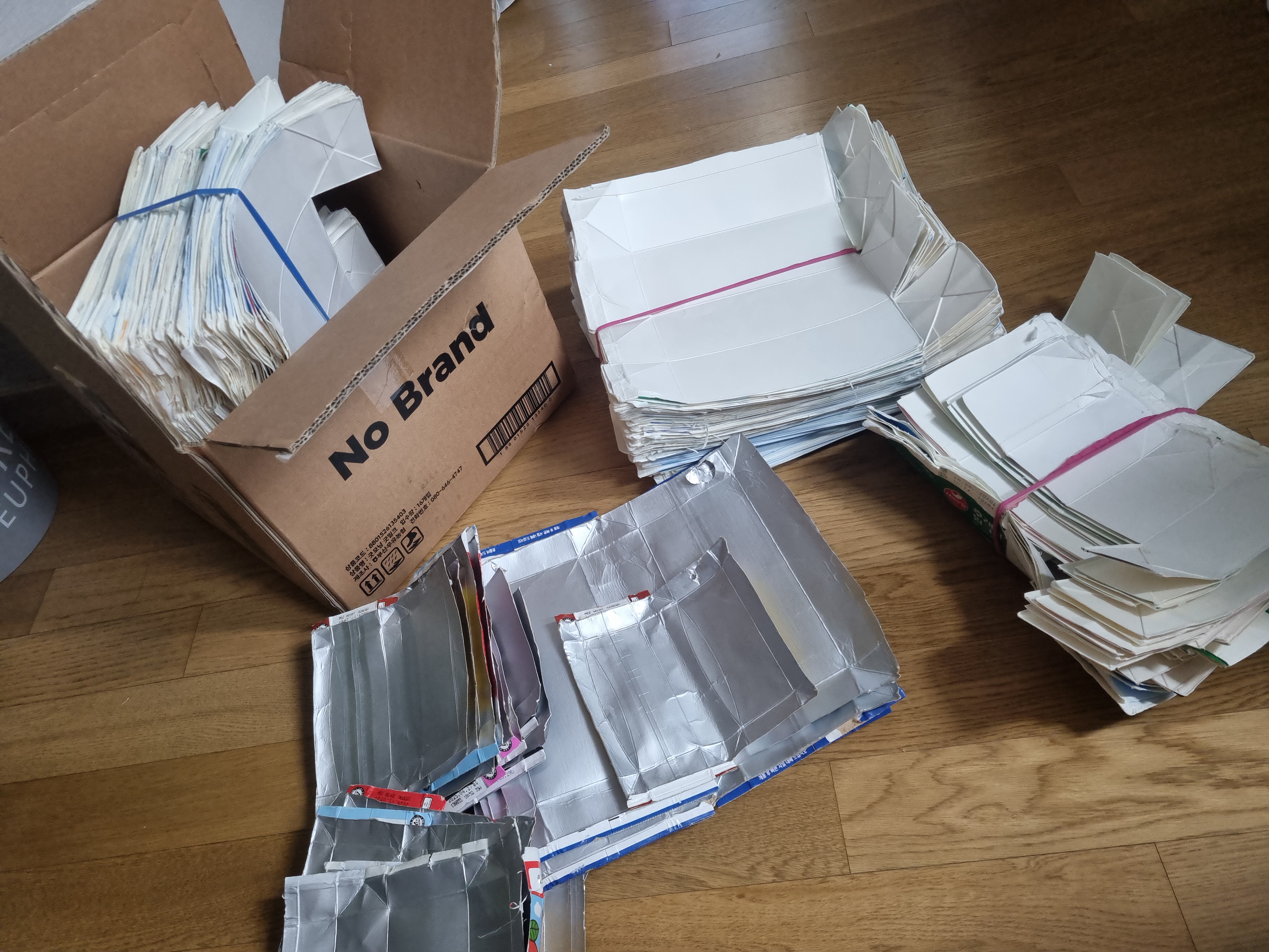 항상 모아 씻고 말리고, 자른 우유팩들 오늘 정리해서 박스에 보내려고 담았어요