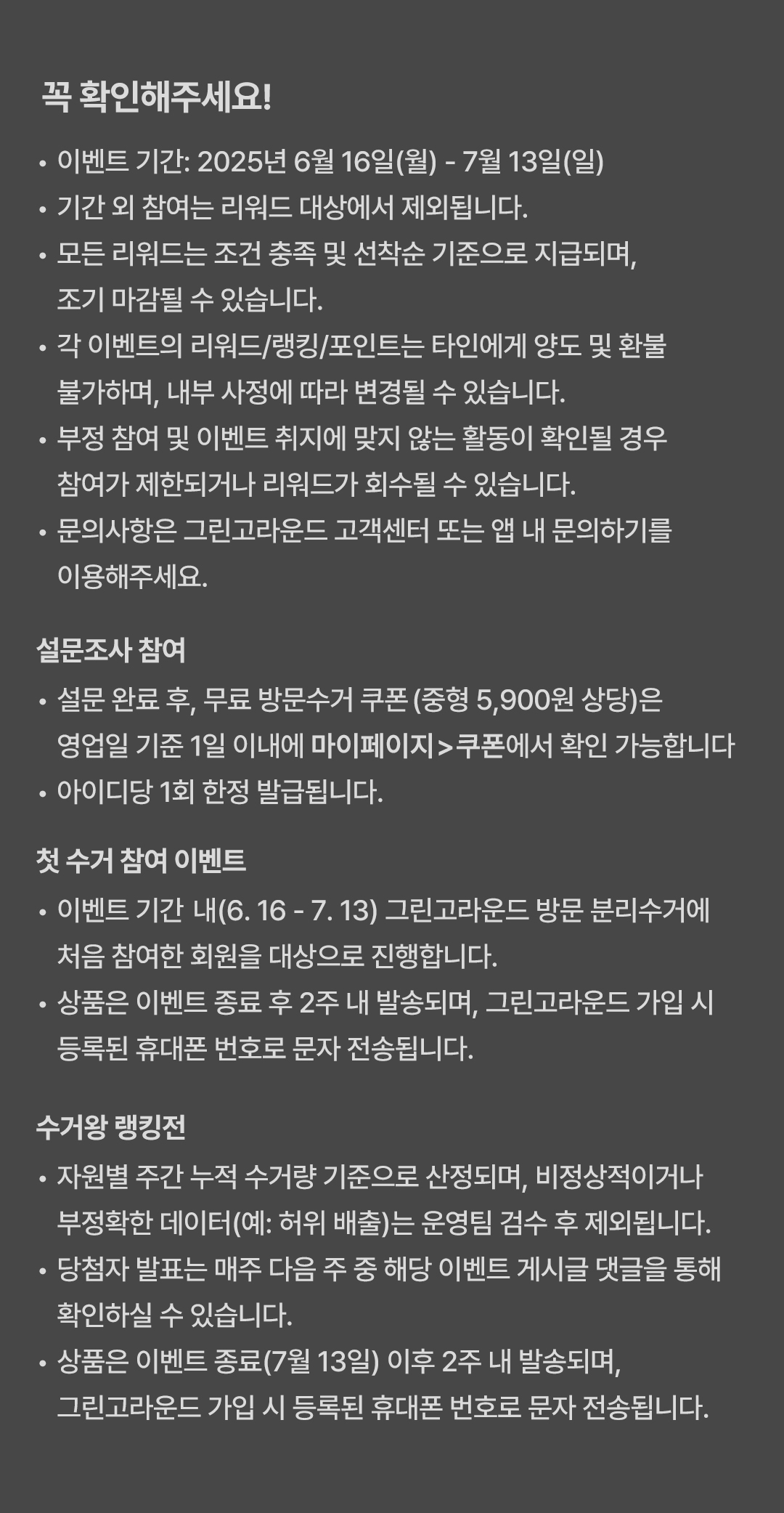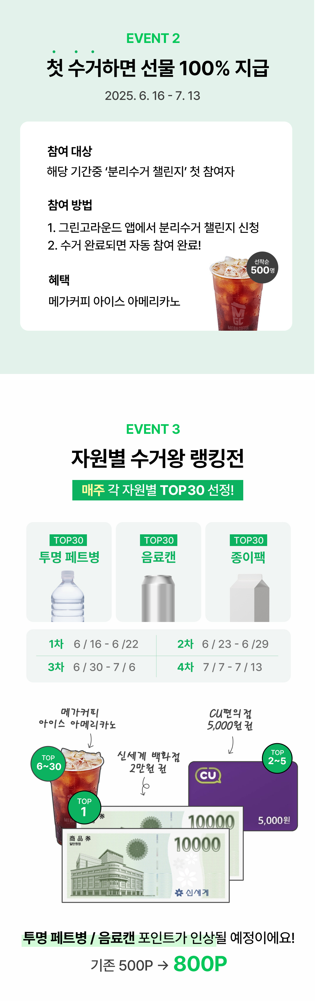 [페트병 4차] 수거왕 당첨자 발표 참여해주신 모든 분들께 감사드립니다. TOP30 당첨자는 아래 답글을 확인해주세요. 경품은 7월 13일 이벤트 종료 후 2주 내 순차 발송됩니다. 앞으로도 많은 관심 부탁드립니다.
