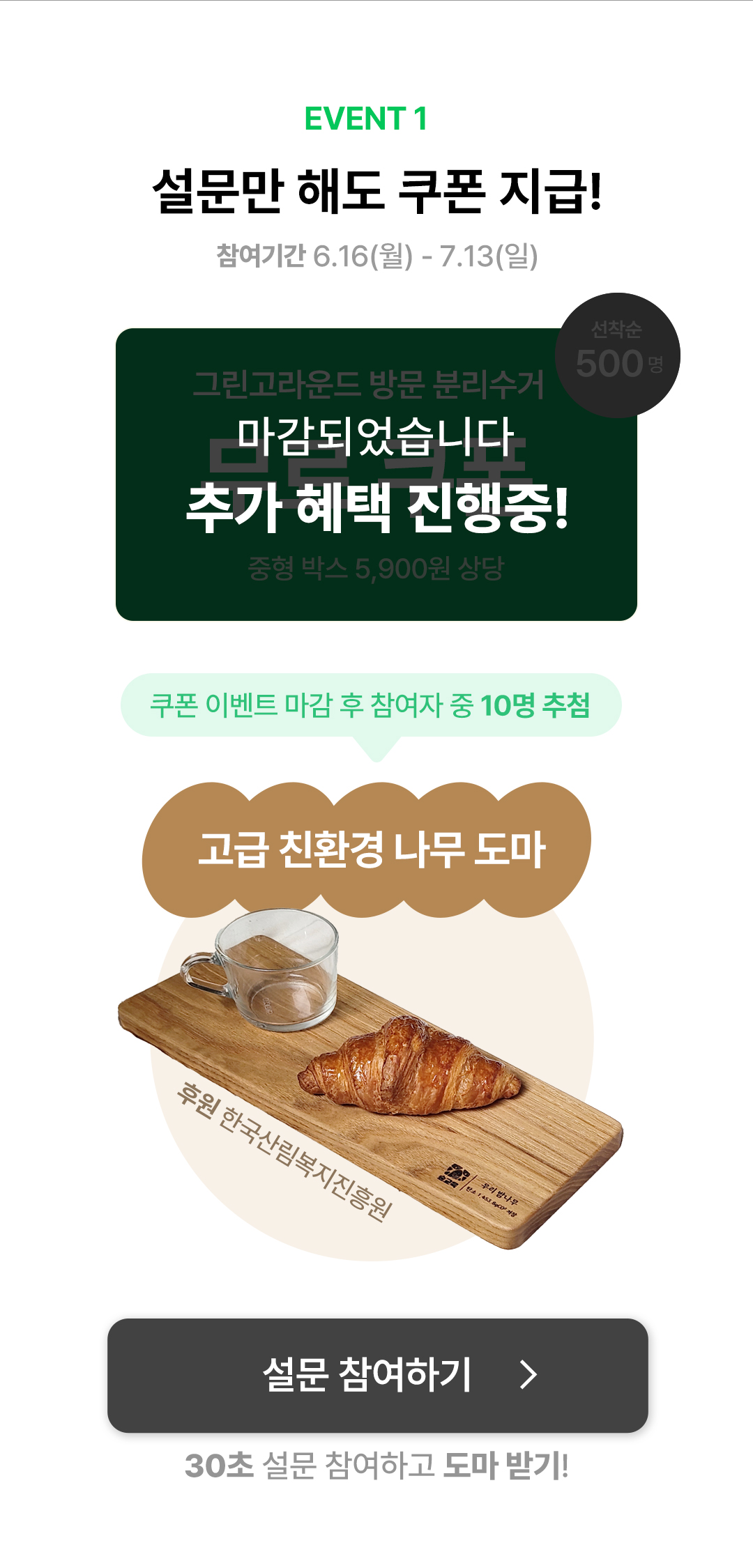 자세히 보기[페트병 4차] 수거왕 당첨자 발표 참여해주신 모든 분들께 감사드립니다. TOP30 당첨자는 아래 답글을 확인해주세요. 경품은 7월 13일 이벤트 종료 후 2주 내 순차 발송됩니다. 앞으로도 많은 관심 부탁드립니다.