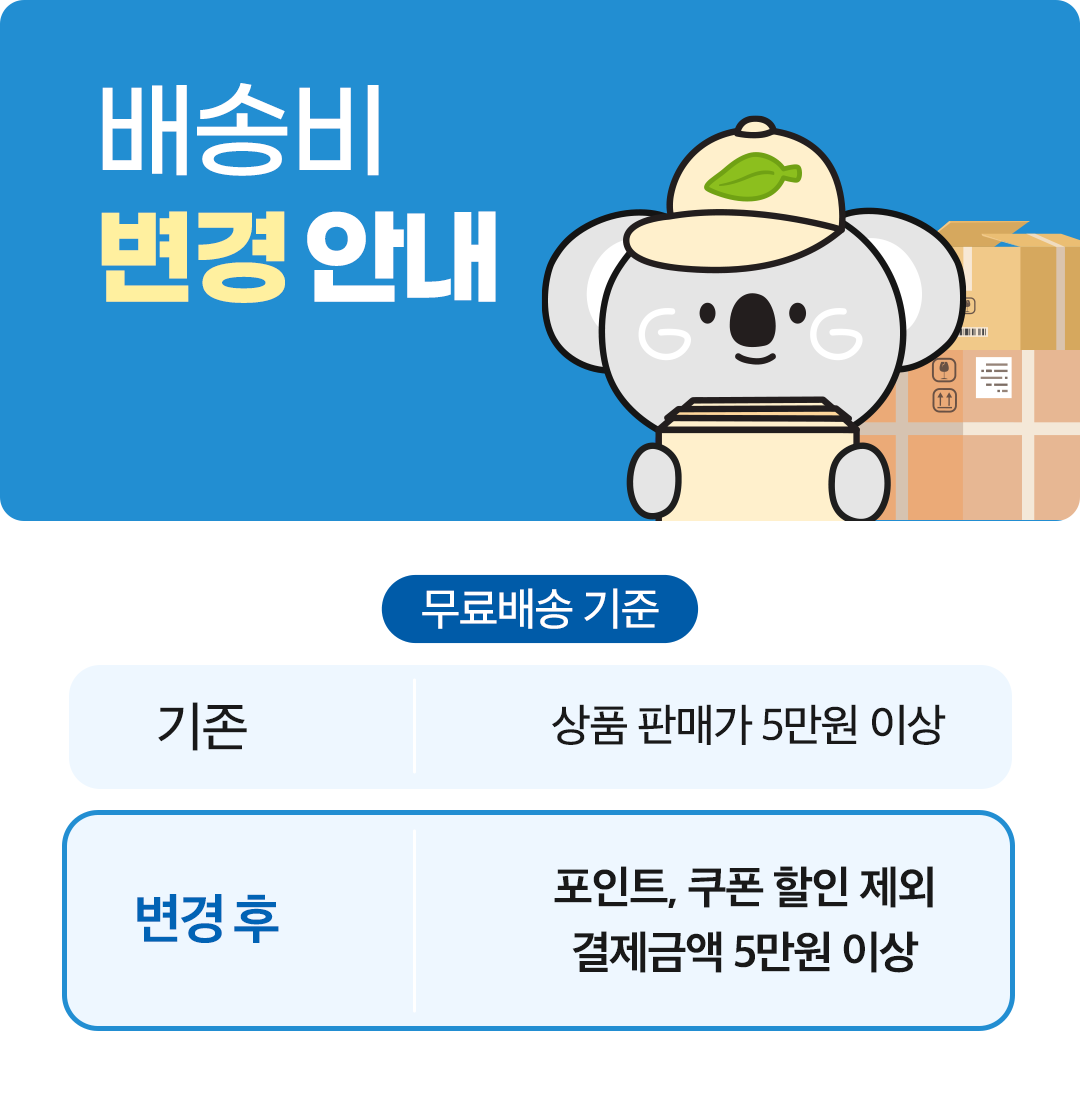 포인트,쿠폰할인을 제외한 실제 결제금액 5만원 이상 무료배송으로 변경됩니다