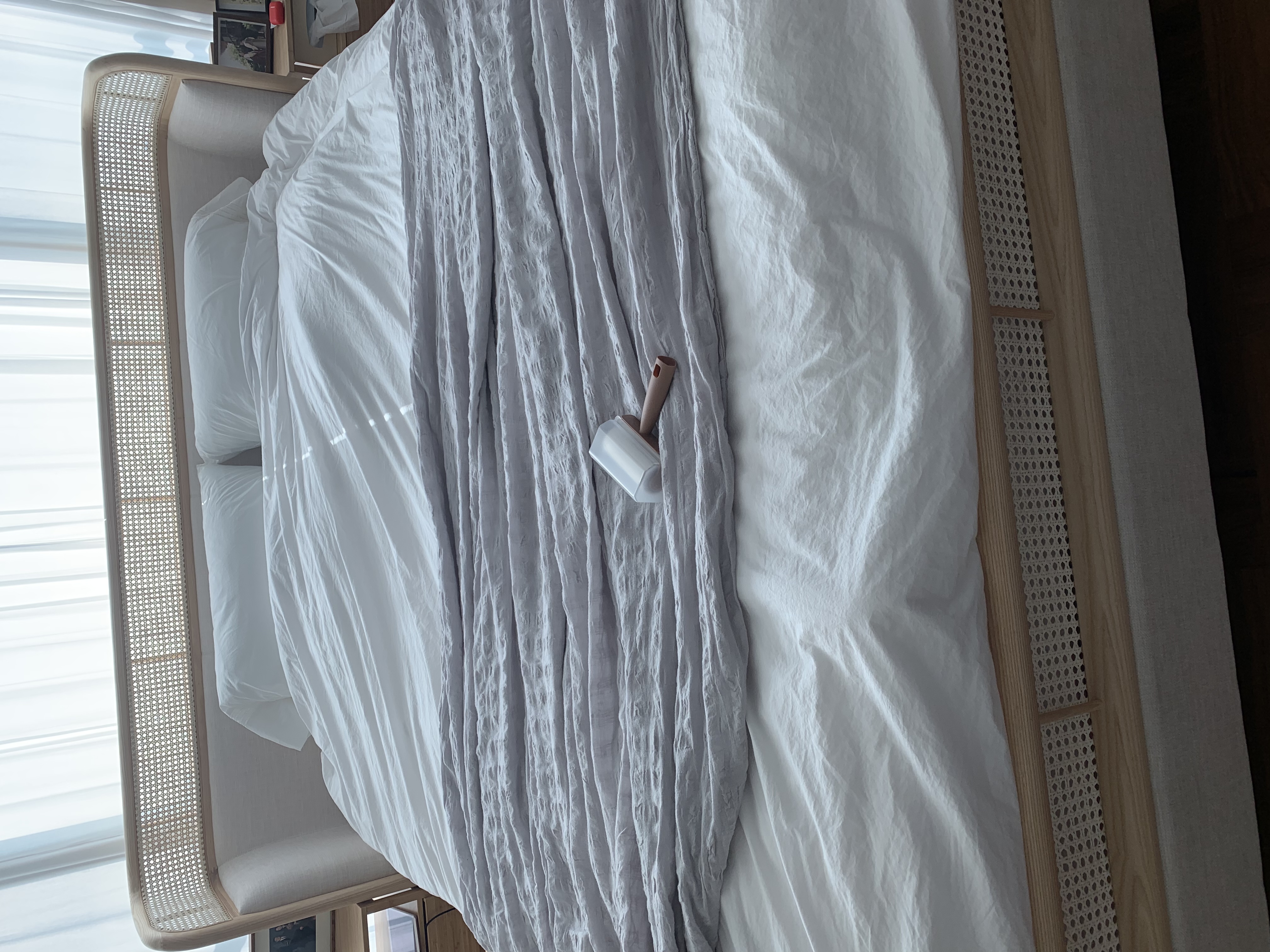 이불도 깔끔하게 펴주고 돌돌이로 머리카락까지 제거해주니 더 넓어보이는 방이 되었어요!
