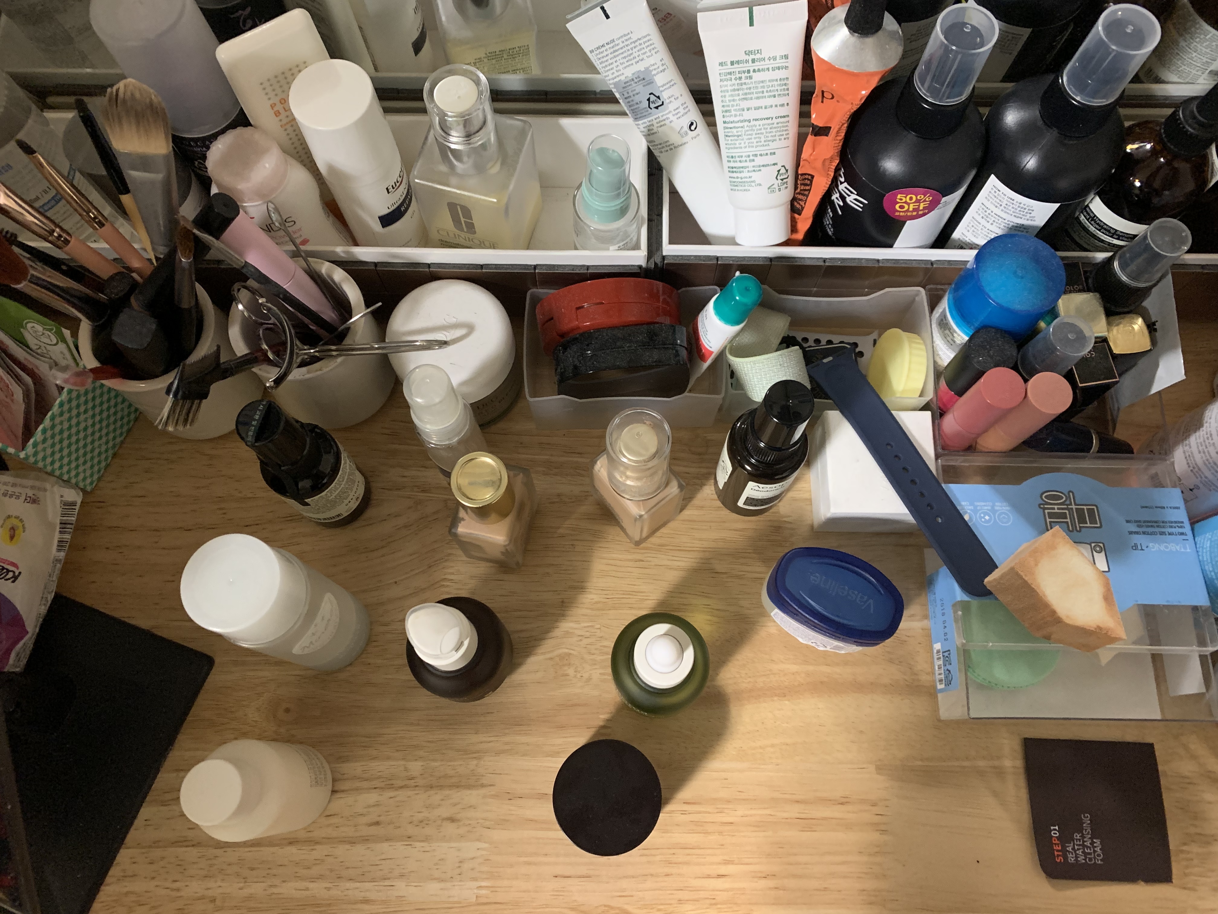 바쁜 아침 화장하고 출근하기에 바빠서 화장대가 엉망이네요.