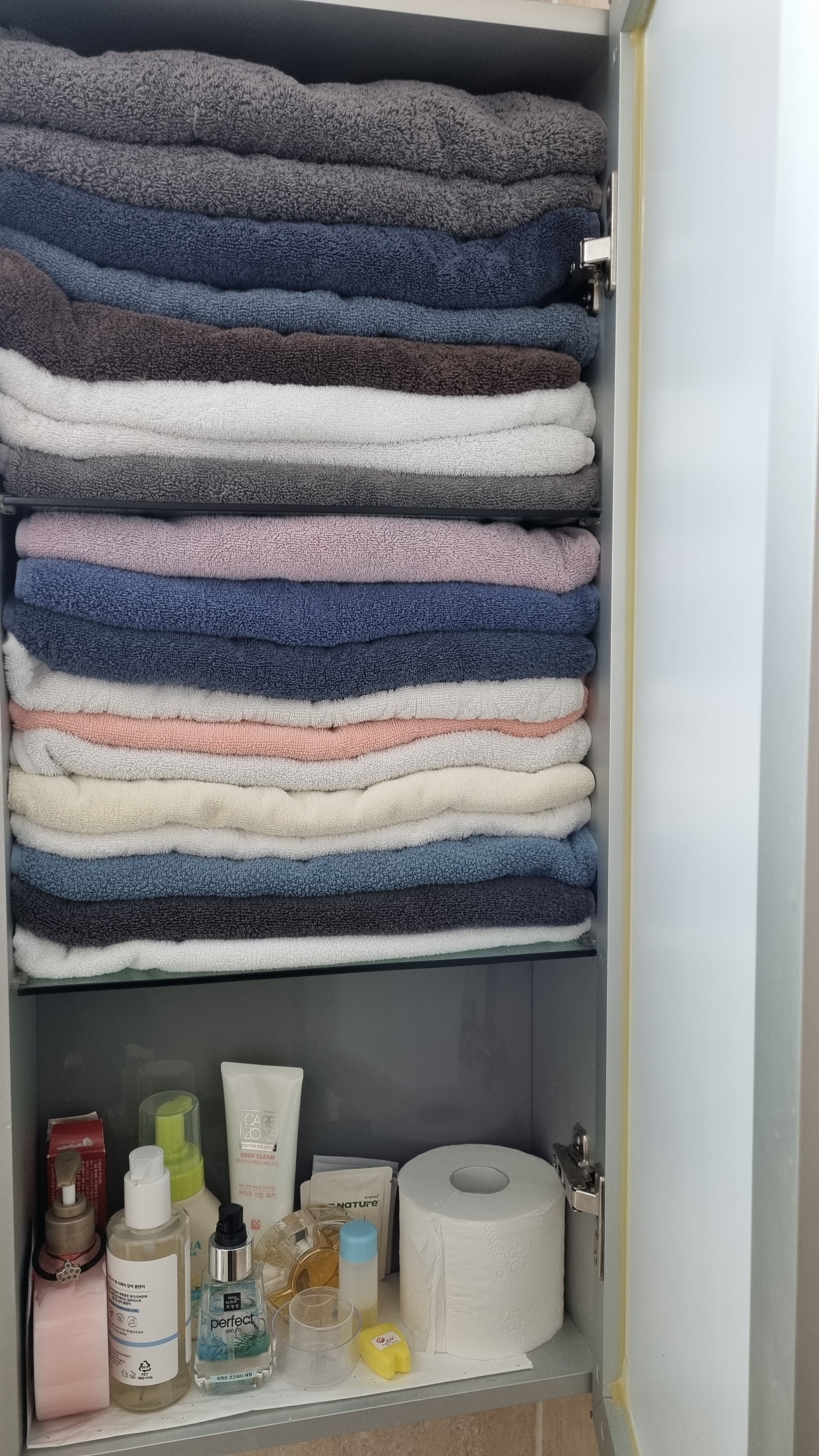 참고로 저는 도톰한 수건은 윗칸에 일반수건은 아래칸에 수납합니다