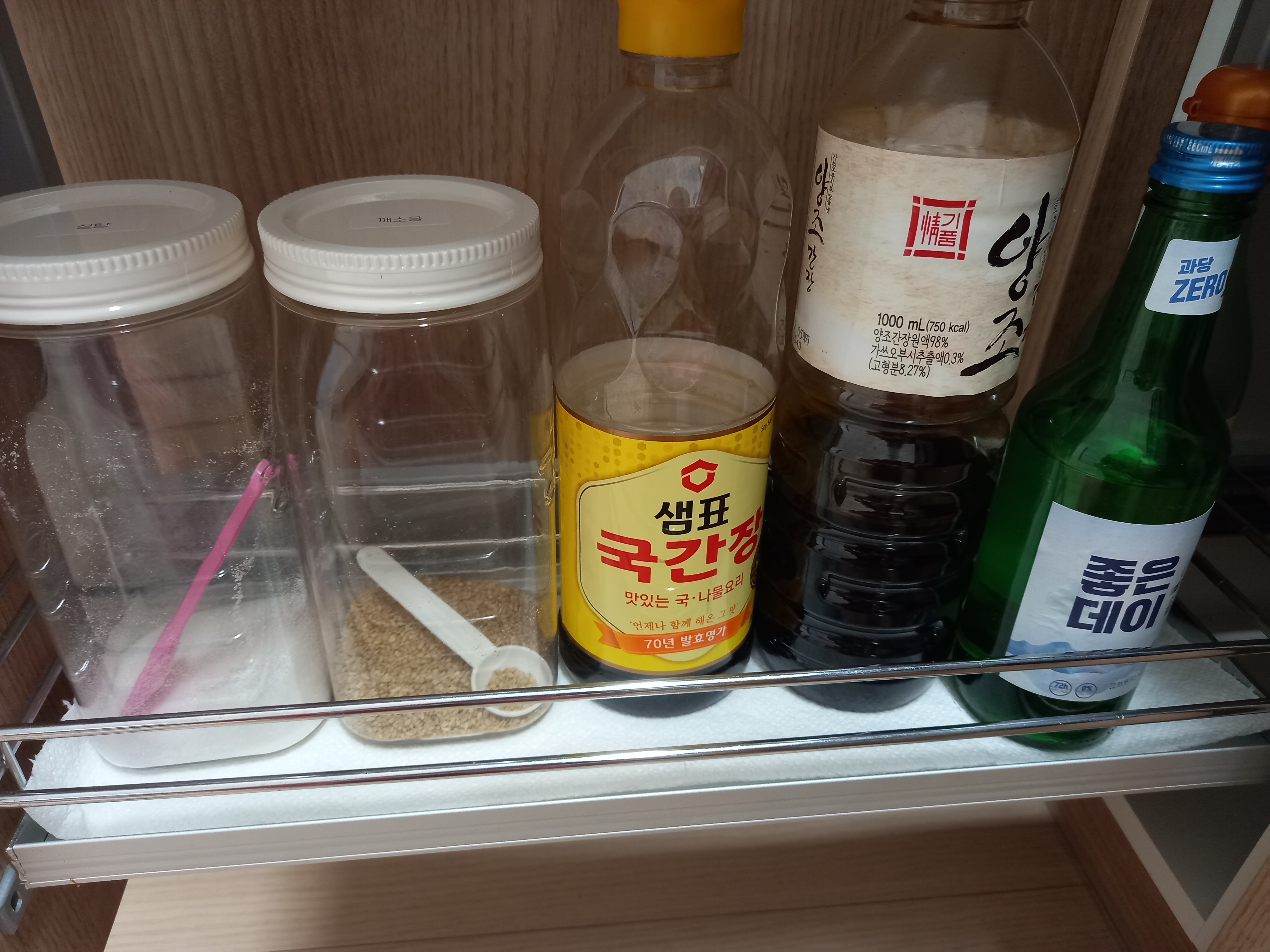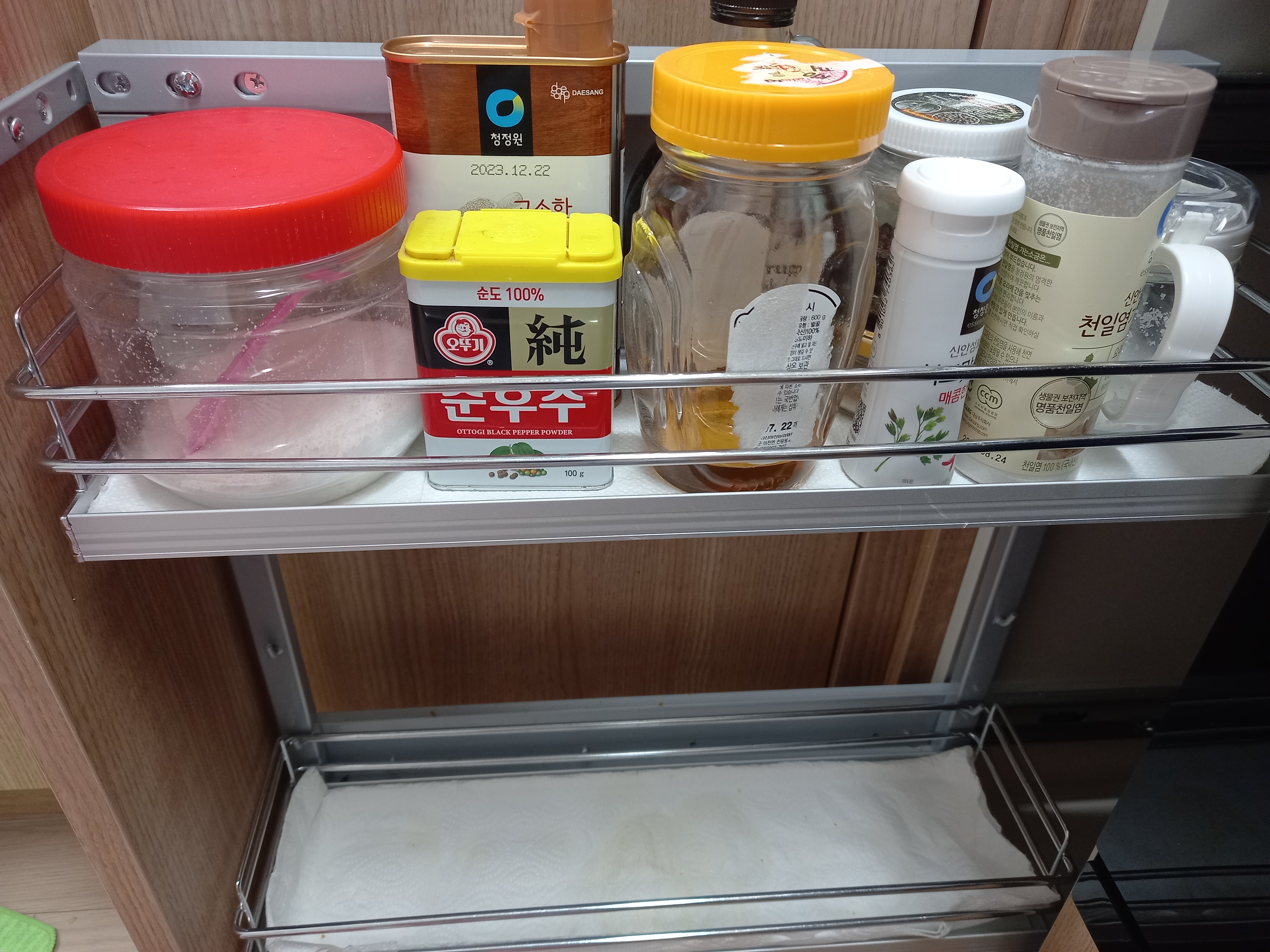 양념류 넣어놓는장인데 기름이랑 흘러서 전에 깔아놓은 키친타올이 많이 더러워졌어요