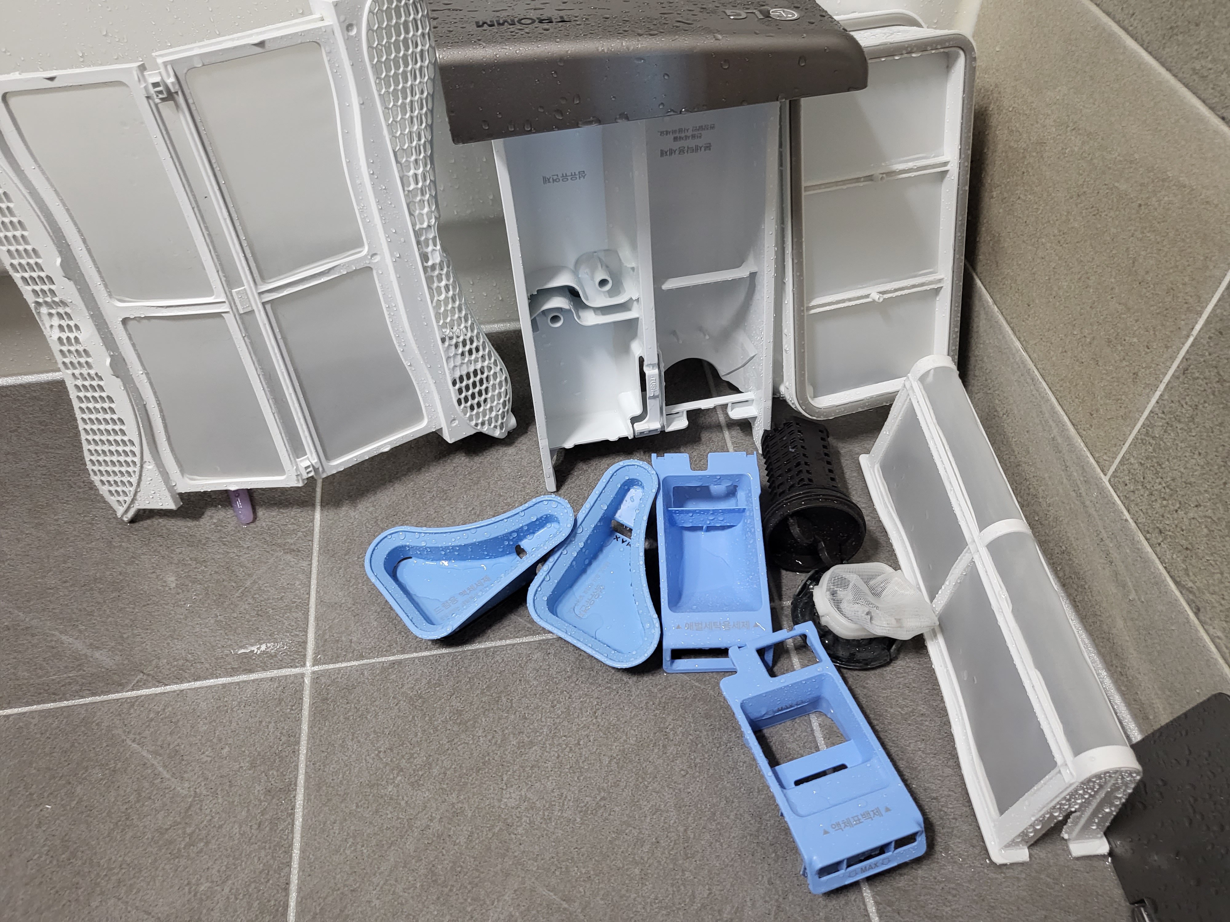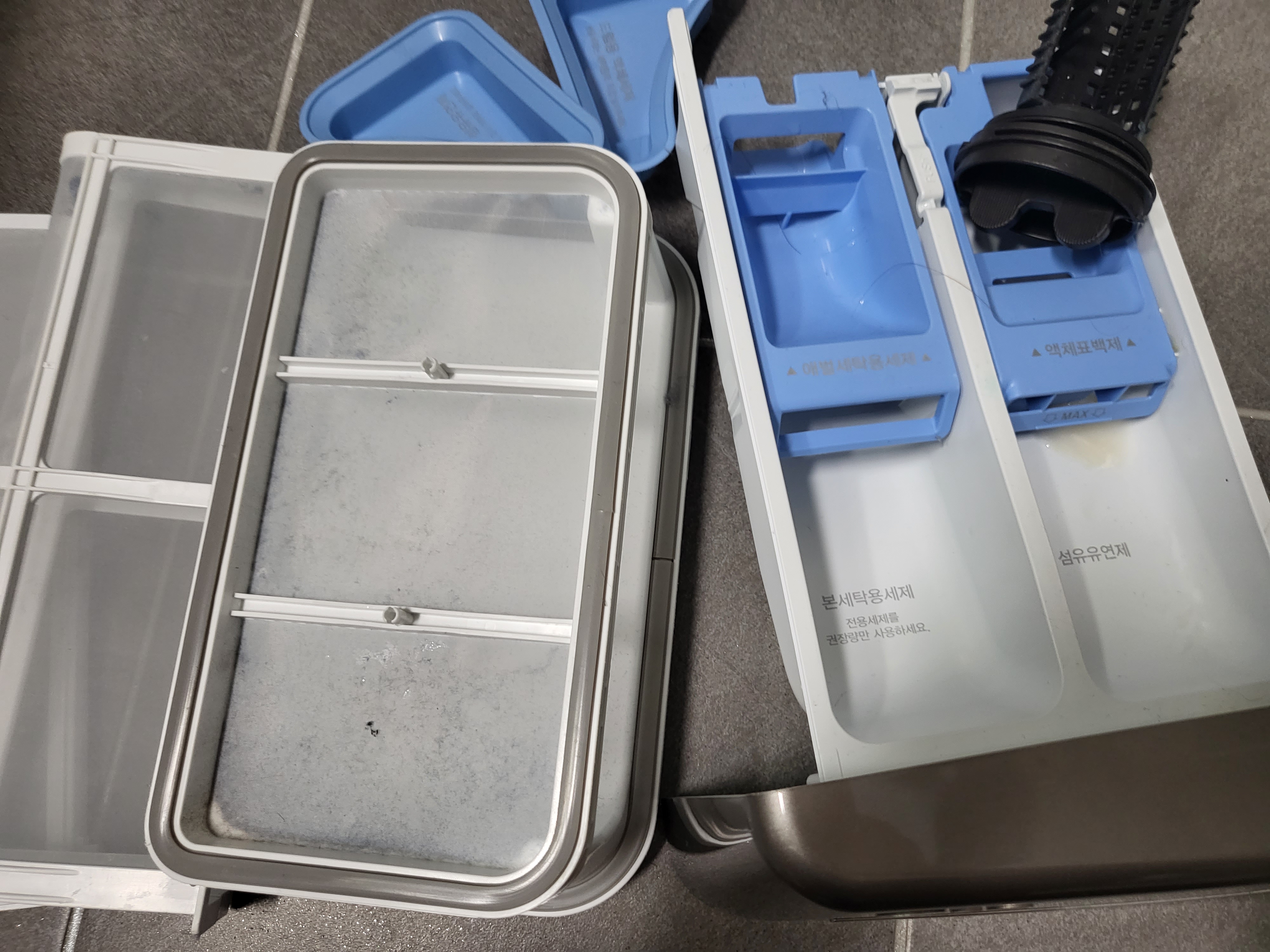 세탁기 세제 입구, 배수구 필터 등이 더러우면 빨래할때 꿉꿉한 냄새 날 수도 있단 정보 듣고 난 뒤로 세탁조 청소 할때 한번에 몽땅 다 세척하고 있어요.