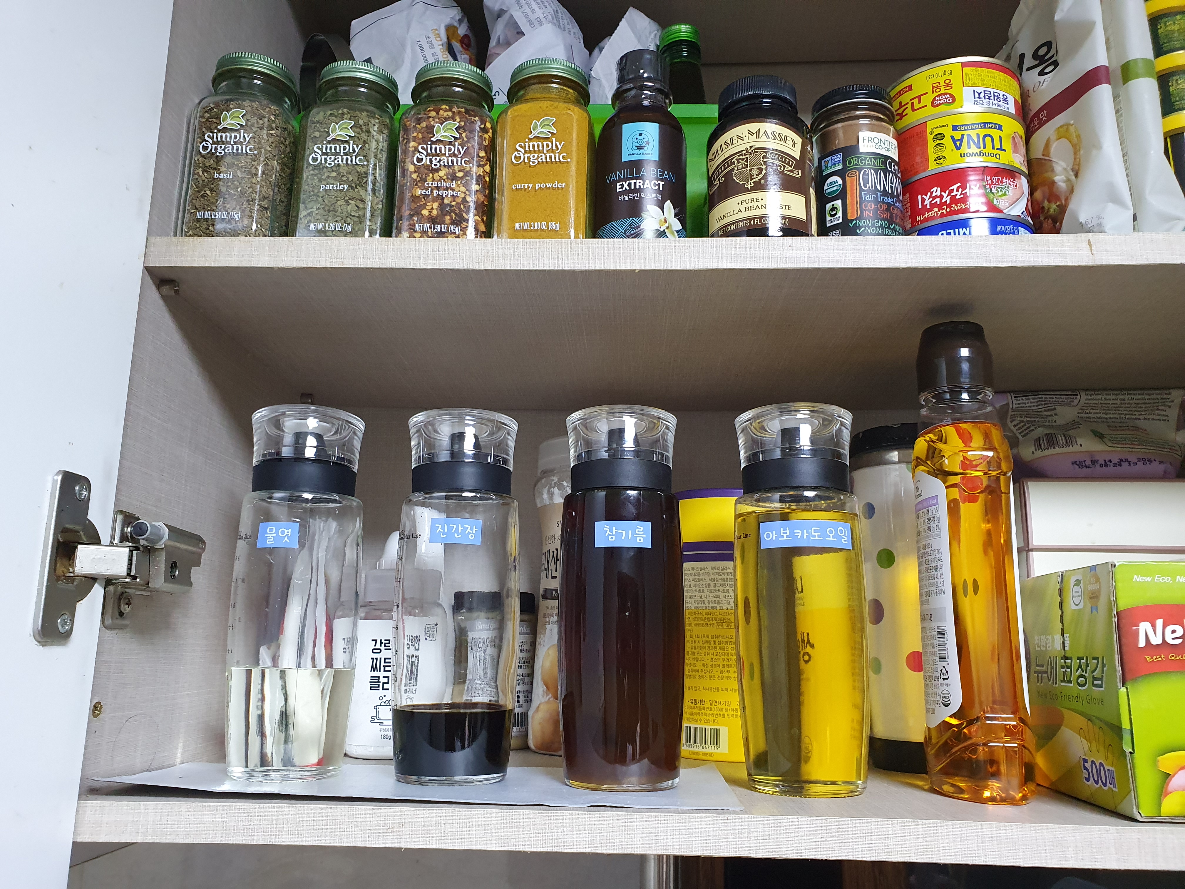 오일병에 액체 양념 정리하고 라벨링 했어요.