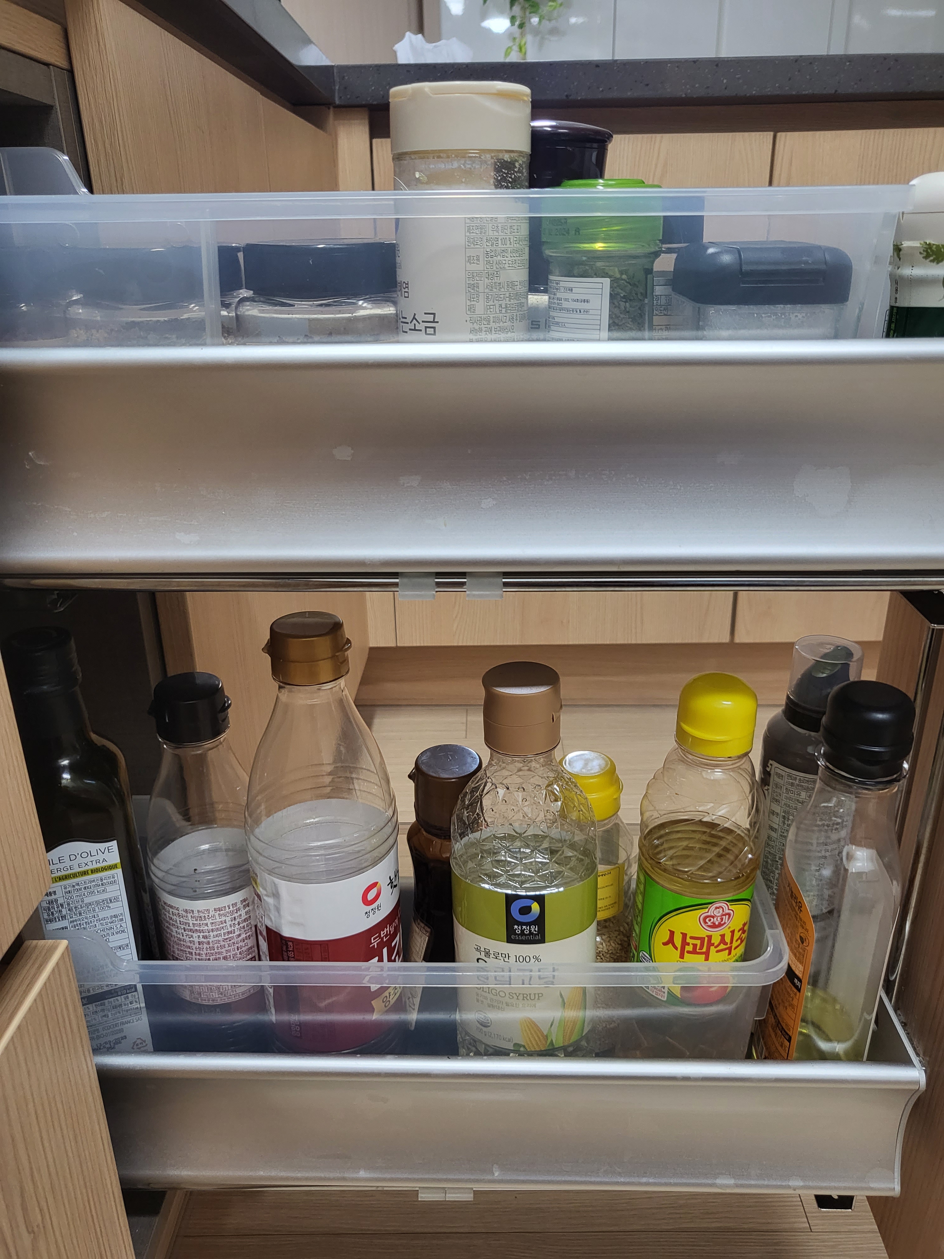 양념통 정리전엔 위칸 아래칸 다 꽉 차 있고 사이즈도 중구난방이었어요. 유통기한 확인하며 버릴거 버리고 최대한 일괄적으로 병 맞추고 작은건 작은거끼리 모아 놓으니, 더 깔끔해 보여서 기분 좋고 심지어 정리 후엔 위칸이 비었네요ㅎㅎㅎ