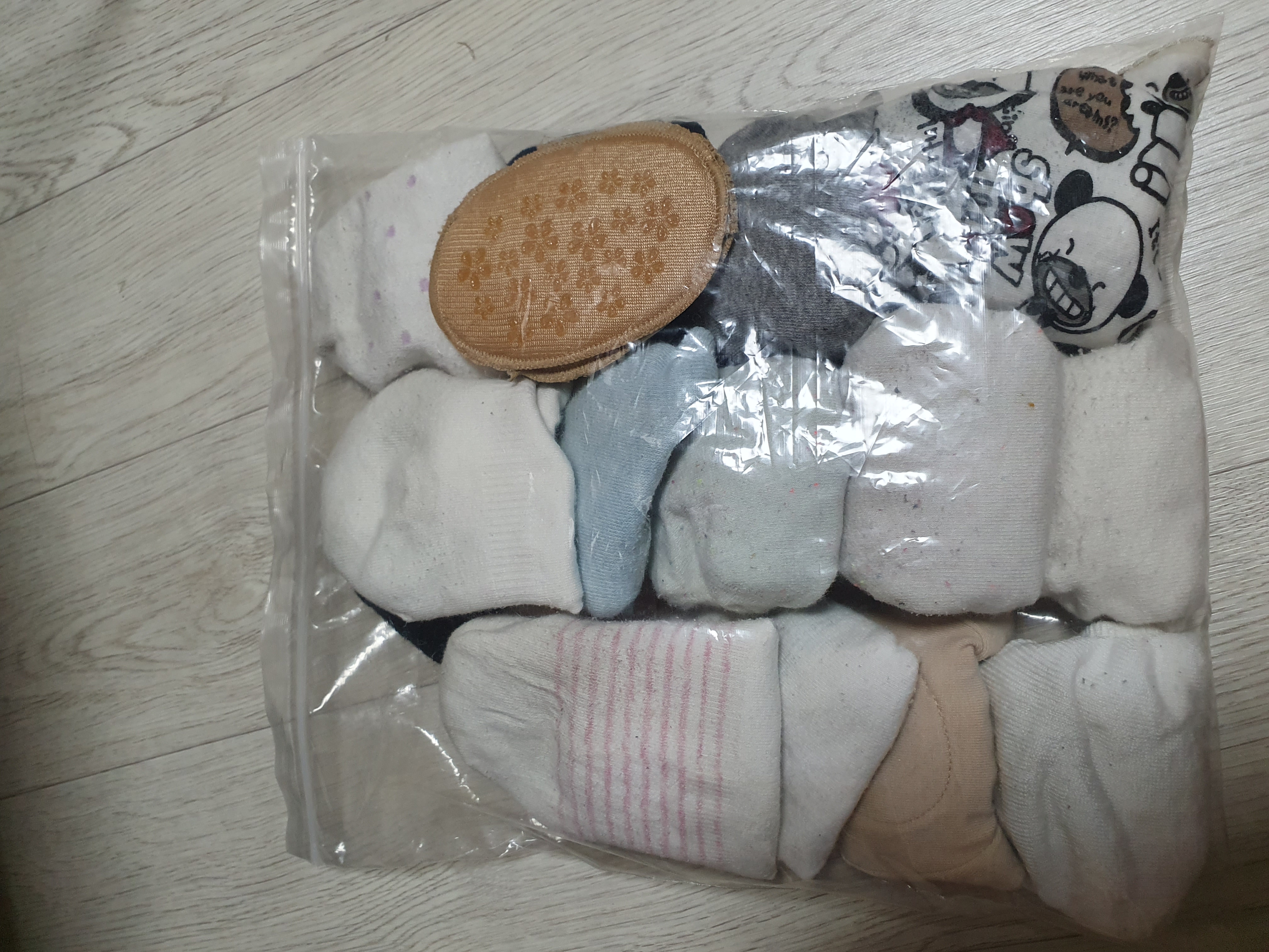 저는 이제 덧신을 안신기에 지퍼백에 넣어서 바닥에 숨겨주었어요. 언젠가 신을 수도 있으니까요.
