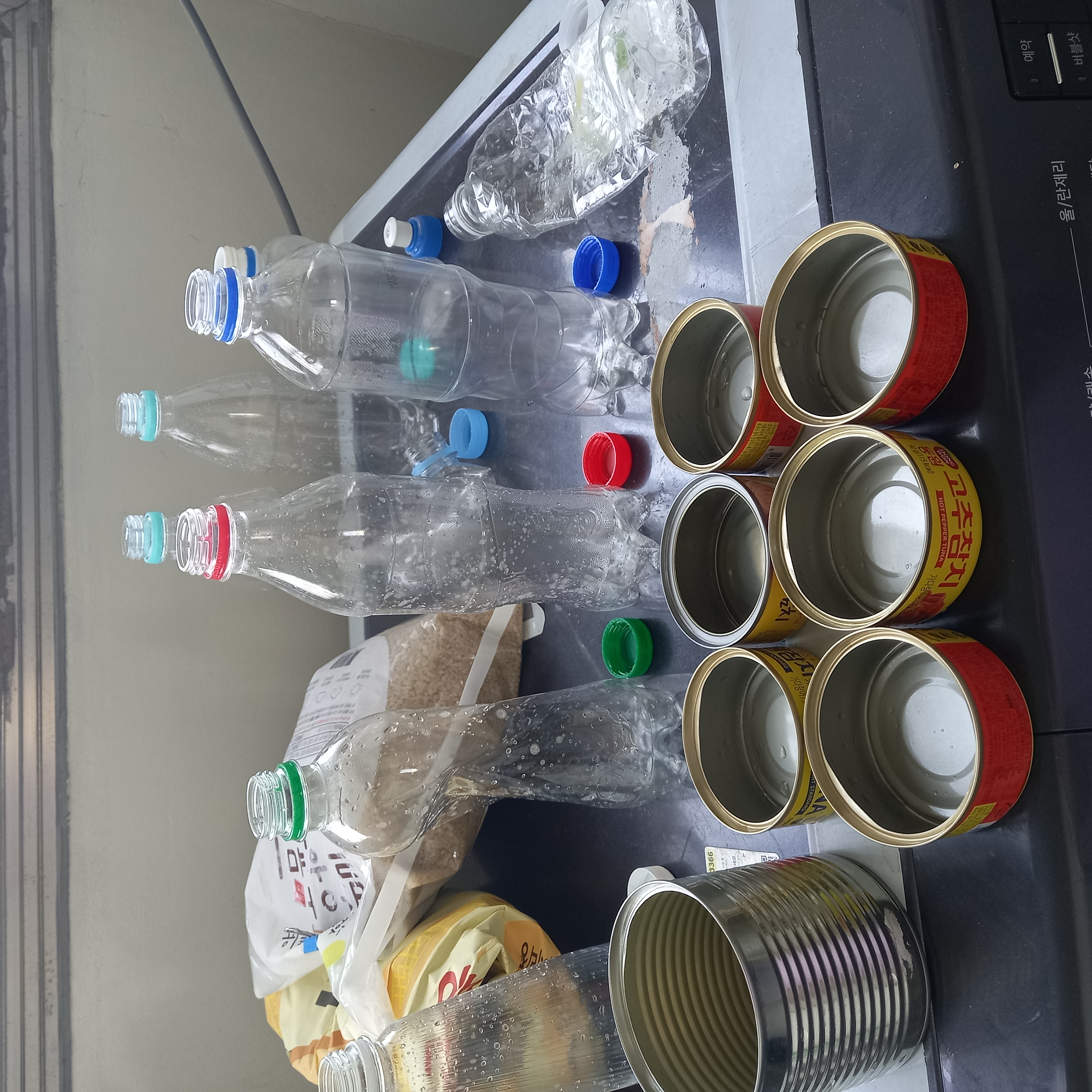 오늘 종이팩, 멸균팩, 갯수도 세어보고 페트병, 참치캔 라벨 떼고 싹 씻어서 말려봅니다.