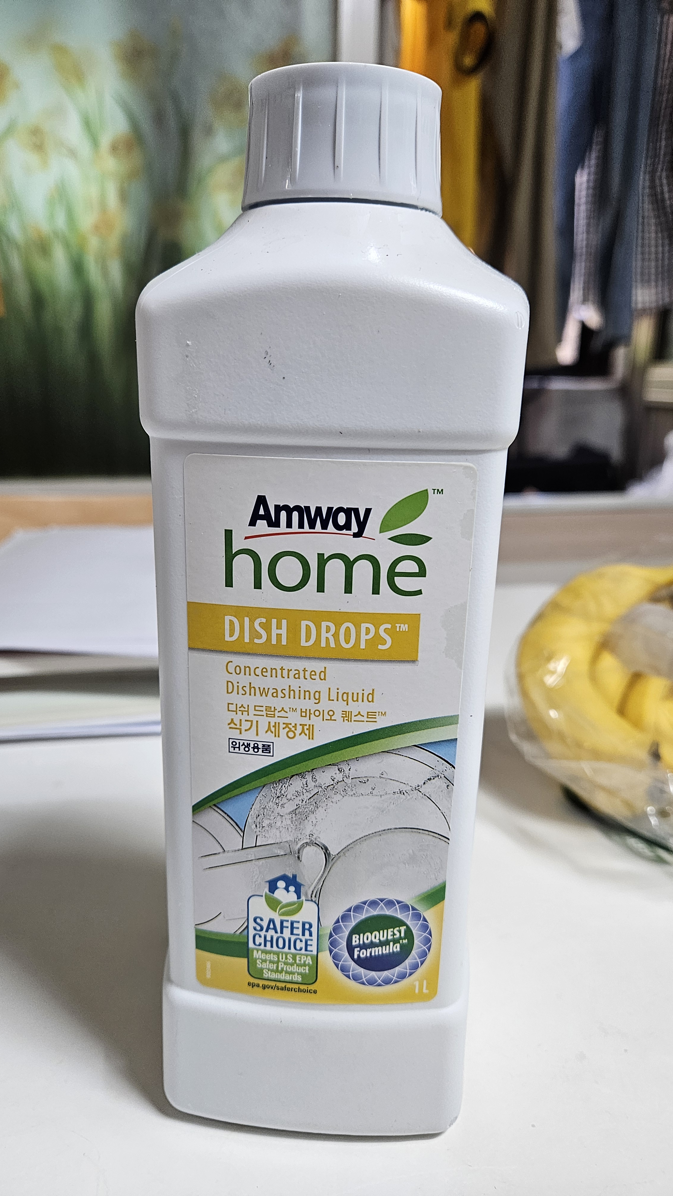 원액이 담긴 식기세정제 용기.원액은 물과 희석해서 세제로 쓰고 원액용기는 버려지지만 썩는 플라스틱. 세제는 천연계면 활성제