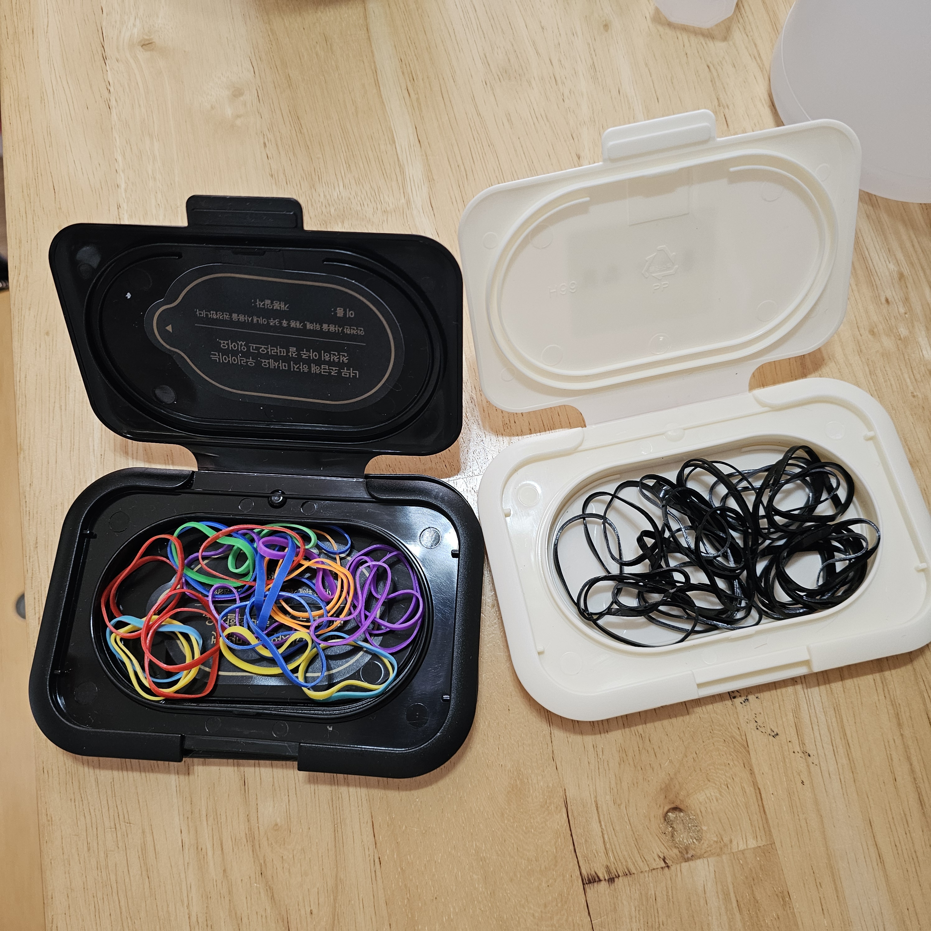 그럼 그 뚜껑 두개를 맞붙여서 아이들 고무줄 넣어서 보관 한답니다~^^