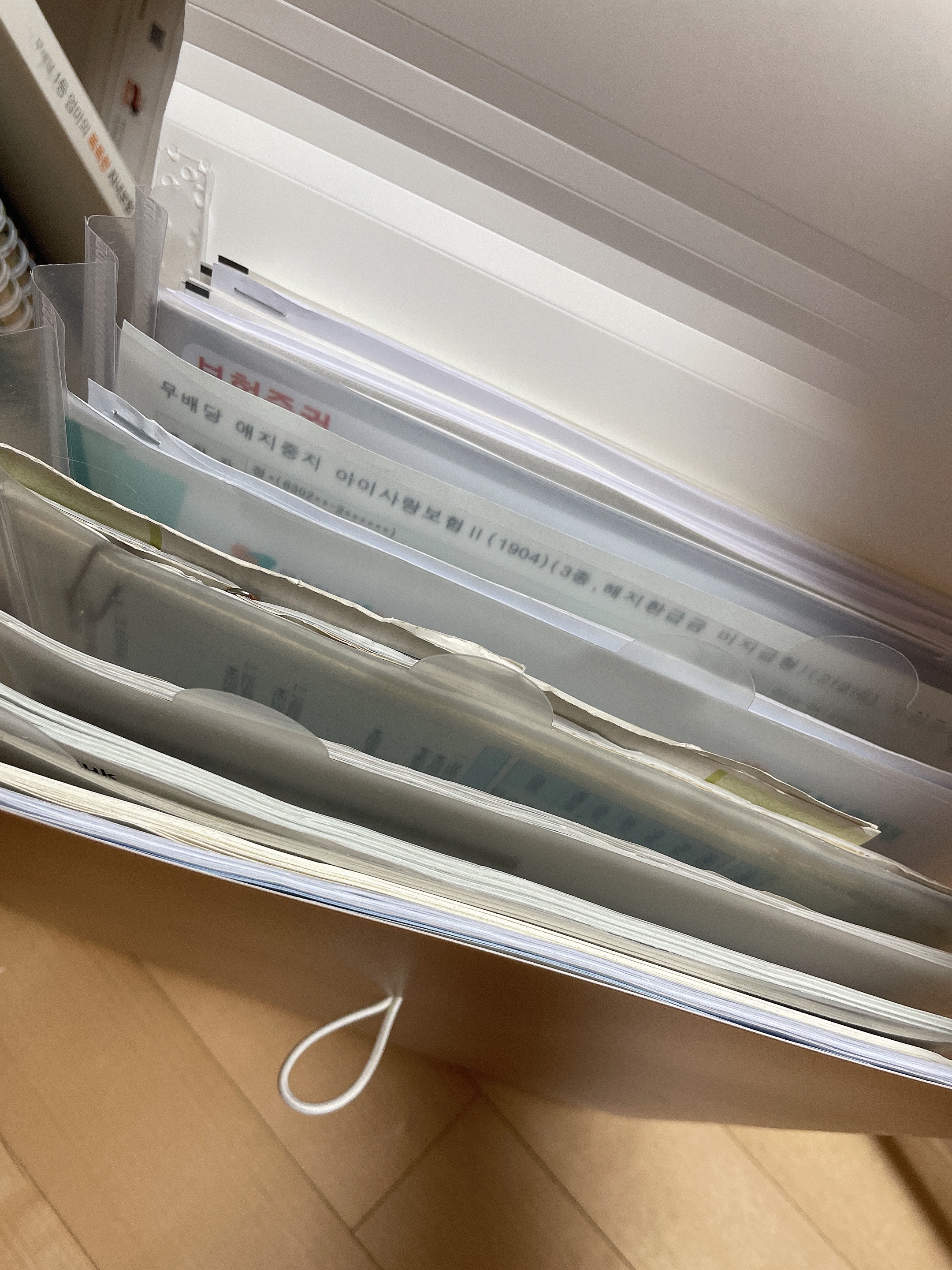 보험하나 가입하면 고급스러운 하드케이스 파일에 서류가 담겨오지요. 혼자 살땐 괜찮았는데 식구가 늘어나서 가입한 보험 수도 많아지니 부피가 상당하네요.