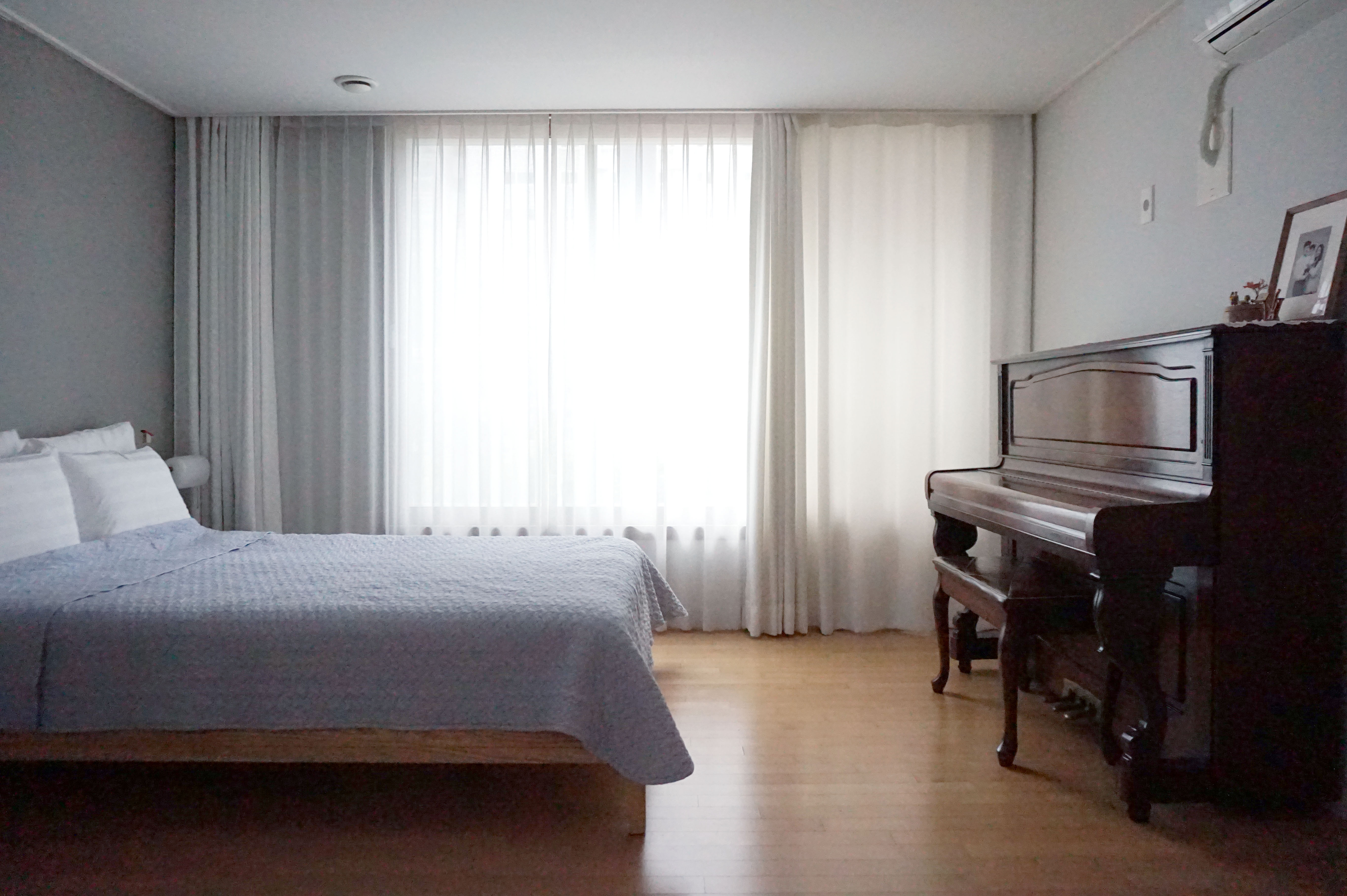 흰색이 좋아하지만 커튼도, 벽지도 방도 흰색으로 할만큼은 아니었어요. 미니멀라이프를 실천하고 보니 흰색의 매력은 어느 색상과 공간에도 잘 어울린다는 점이었어요. 커튼 컬러가 다양하면 침구색상에 제약이 있으니 침구에 따라 커튼의 색을 달리하거나 반대의 경우가 생기는데 흰색 커튼은 어떤 컬러의 침구와도 잘 어울리니 커튼에 맞는 침구를 다양하게 구비할 필요가 없어요. 그리고 질리지 않구요. 이불장이 가벼울 수 있는 이유는 심플하고 깨끗한 컬러를 골랐기 때문이에요.