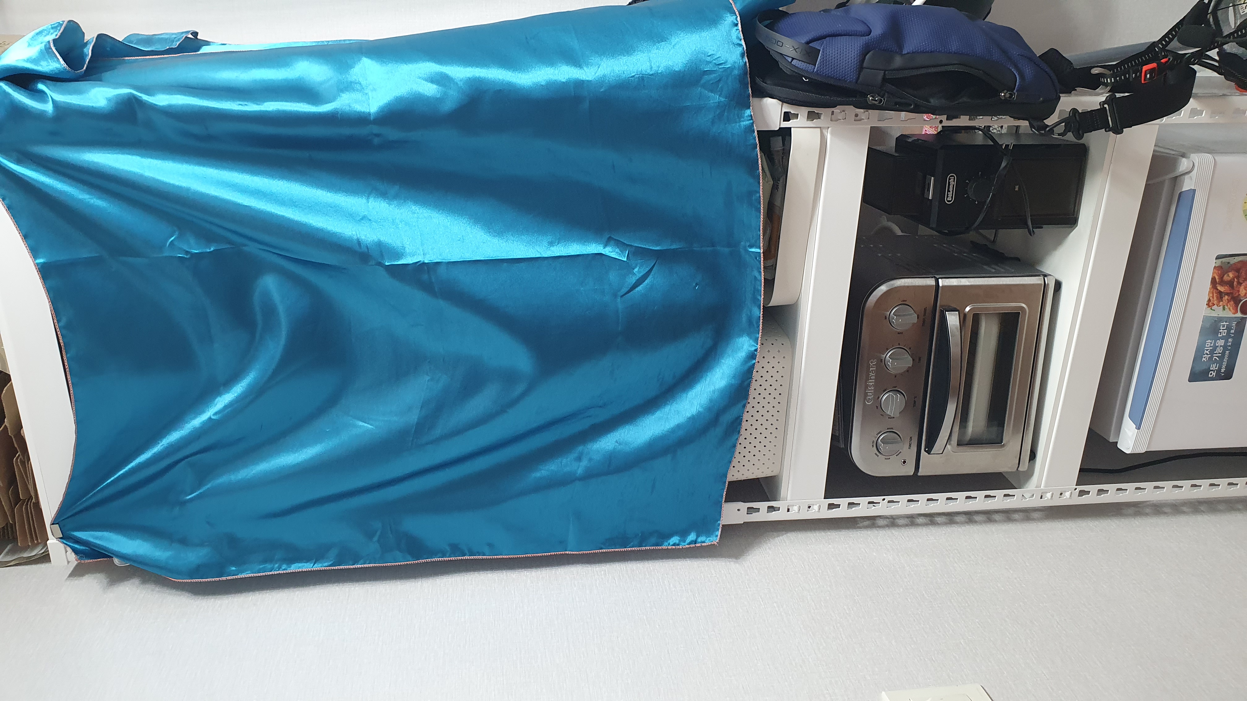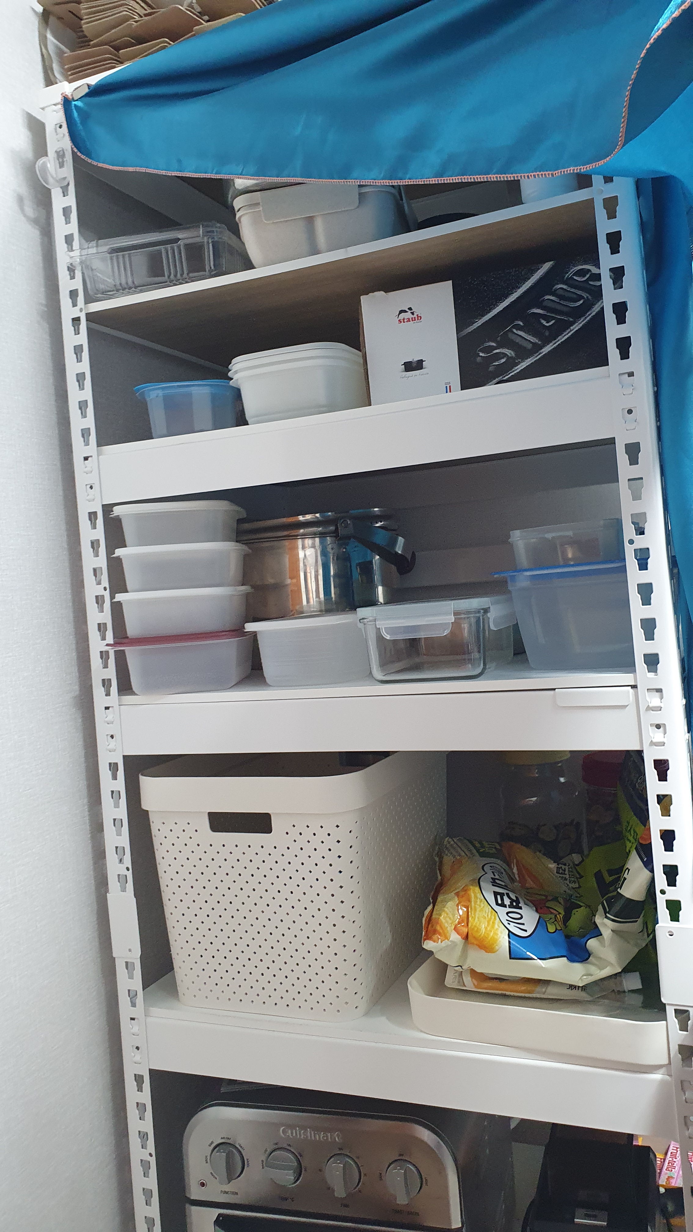 상단에 자석으로 고정시켜서 그릇들을 가려줬어요.