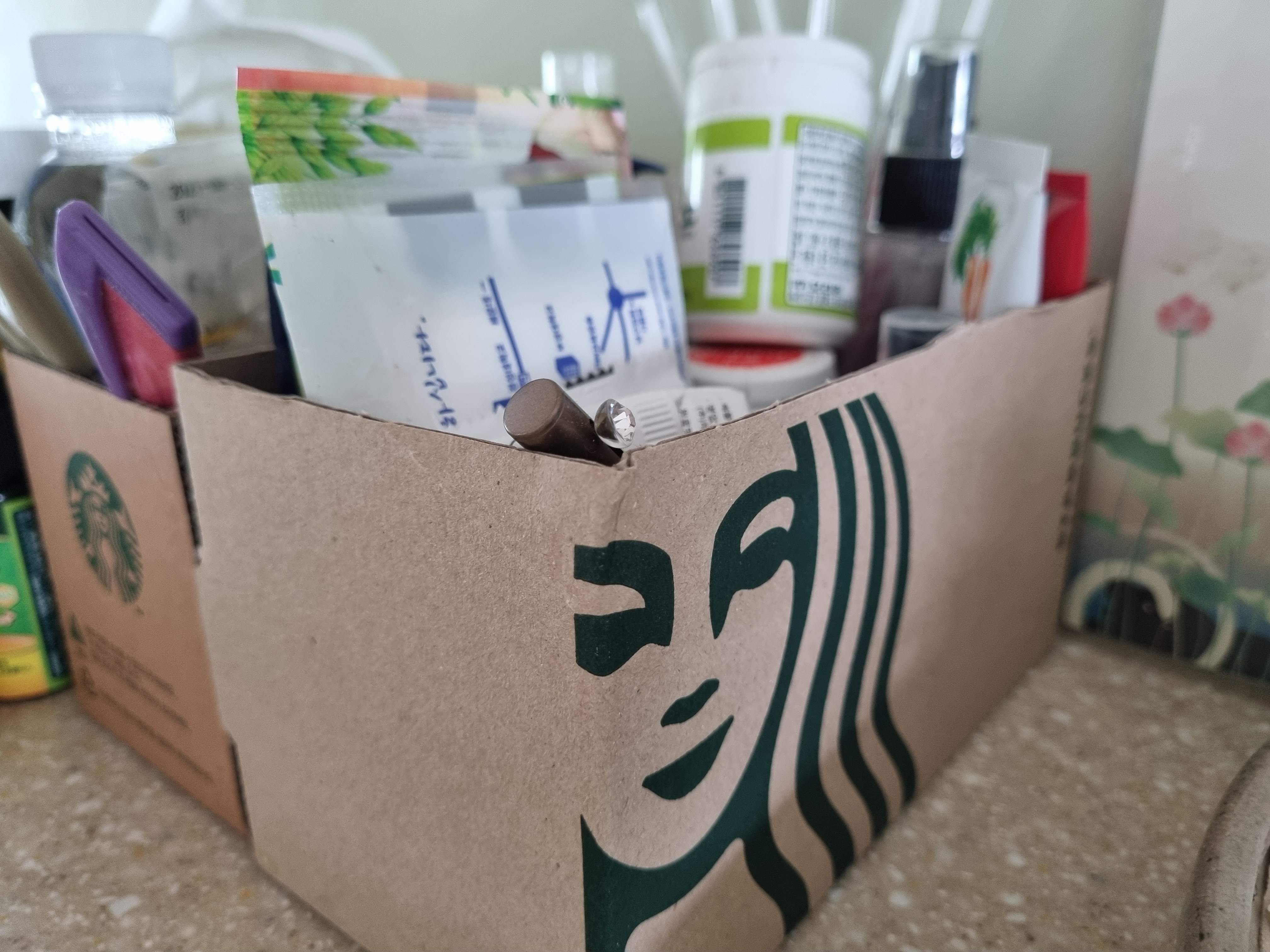 스타벅스 음료 캐리어를 손잡이만 잘라서 두개를 연결한뒤 종류별 수납함으로 쓰고 있어요. 식탁에 널부러져 있던 휴대용 물티슈 소독제 등 자잘한 물건들 수납하기 딱입니다 탄탄하고 이쁘긱까지!