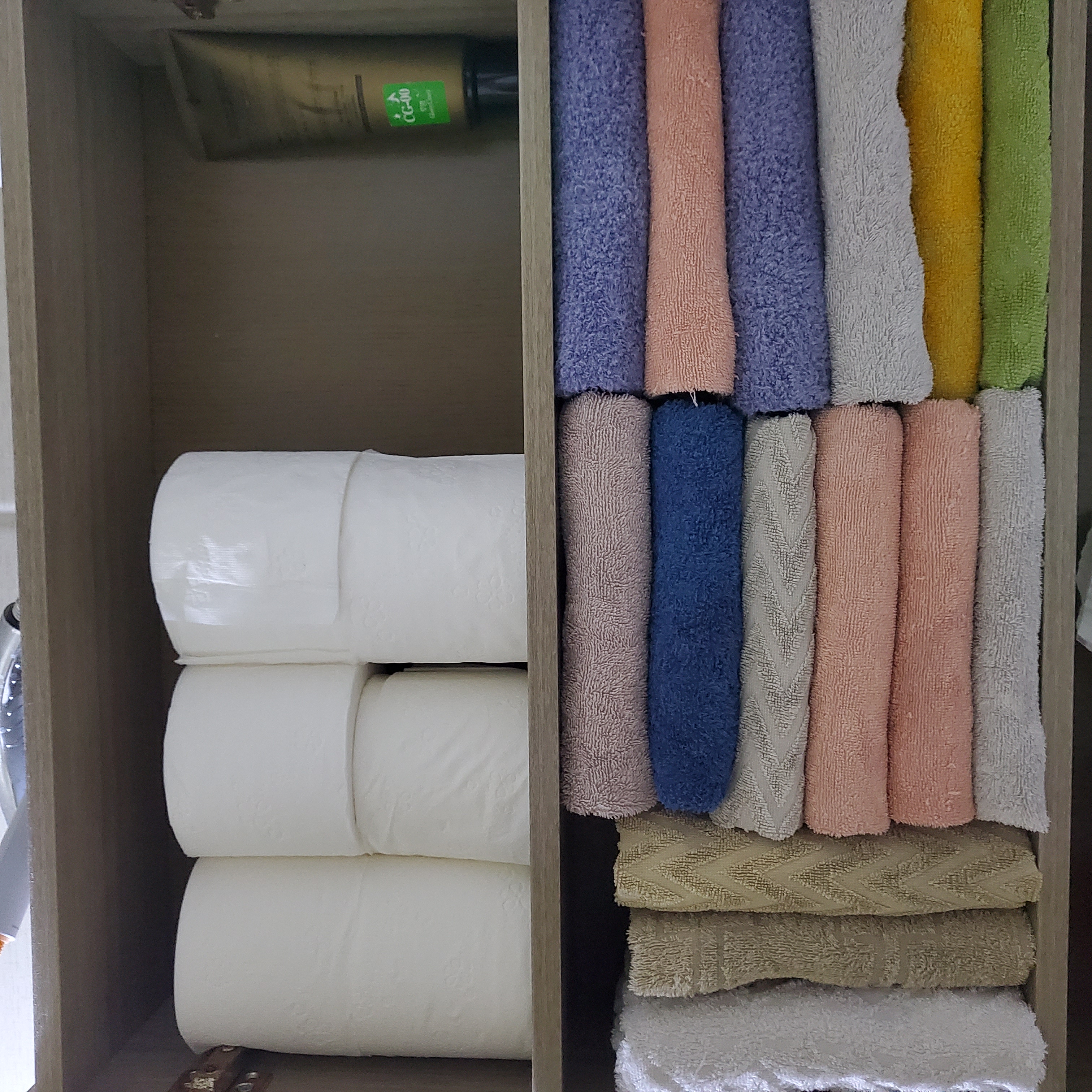 여름철이기도 하지만 쨌든 날 좋아 널어 놨더니 뽀송뽀송 잘말라 수건 개서 욕실 수납장 정리하며 보관해요…