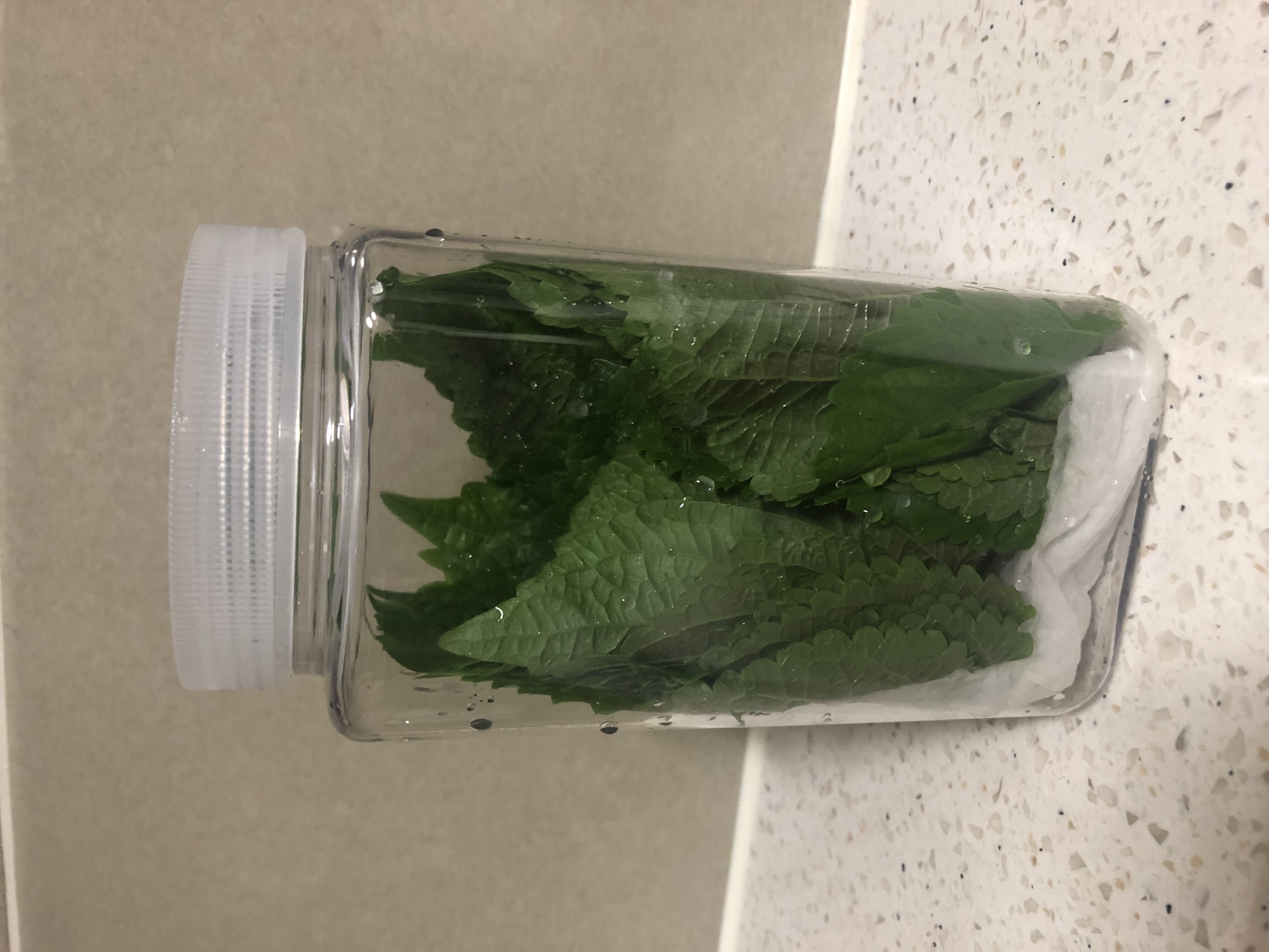 긴 용기 밑에닥에 키친타올을 물을 묻혀서 깔아주고 깻잎 꼭지 부분을 세워서 보관해요.