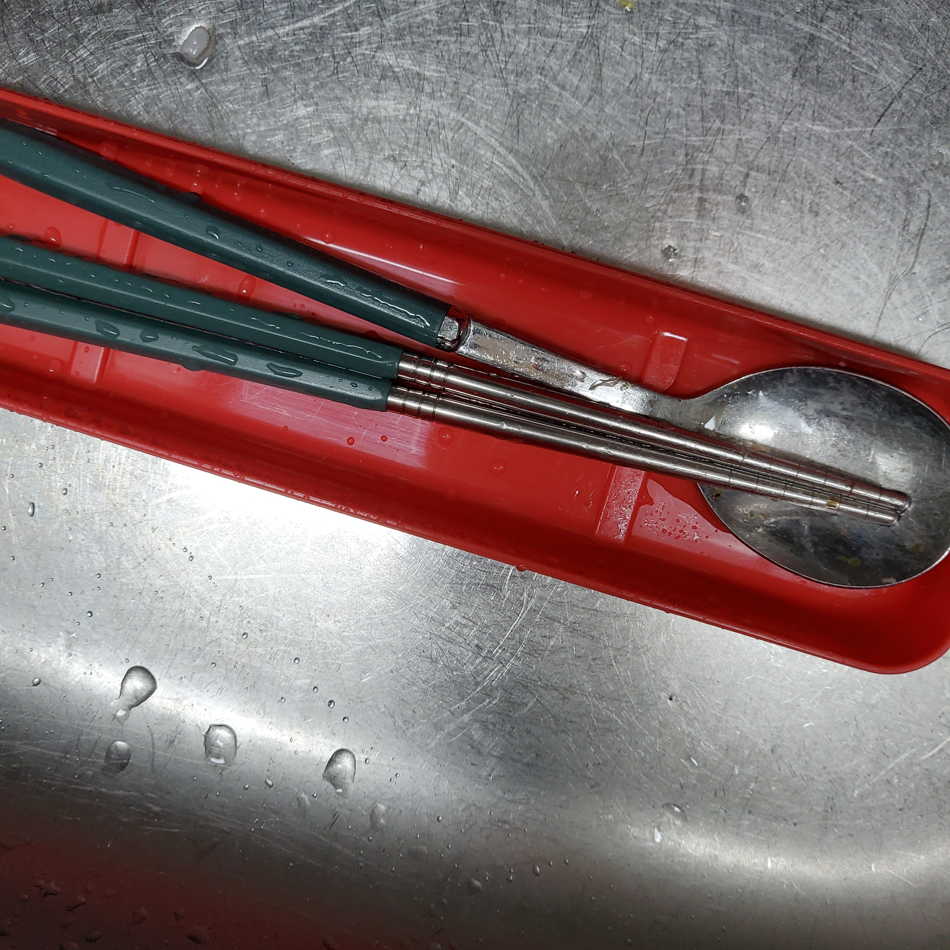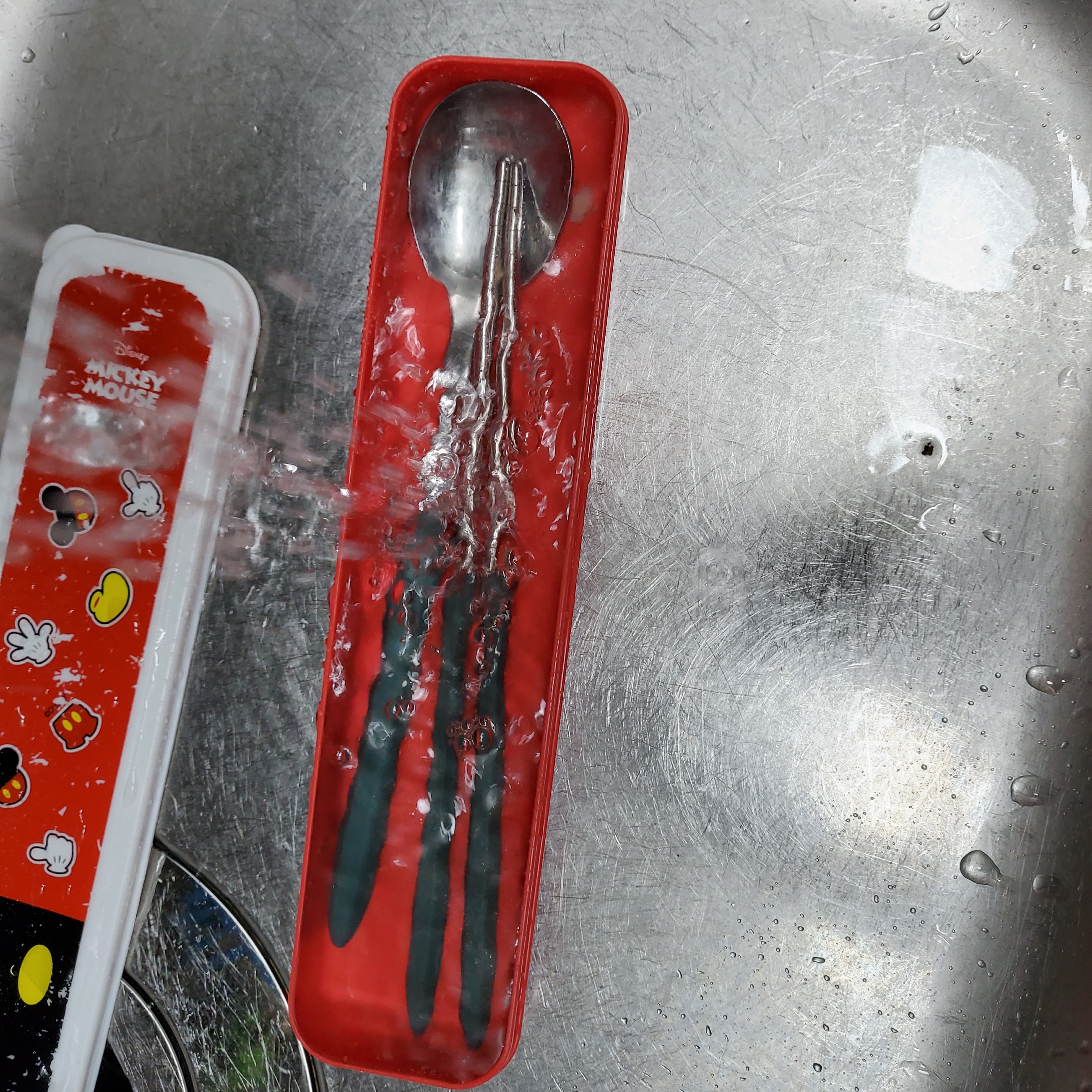 아이들 수저세트 학교 갔다 가져오면 음식물이 수저세트에 말라있어 깨끗하게 설거지 할 수 없으니 굳이 뜨거운물 사용하지 않아도 물에 담그어 놓았다 설거지하면 말끔하게 세척되요~~