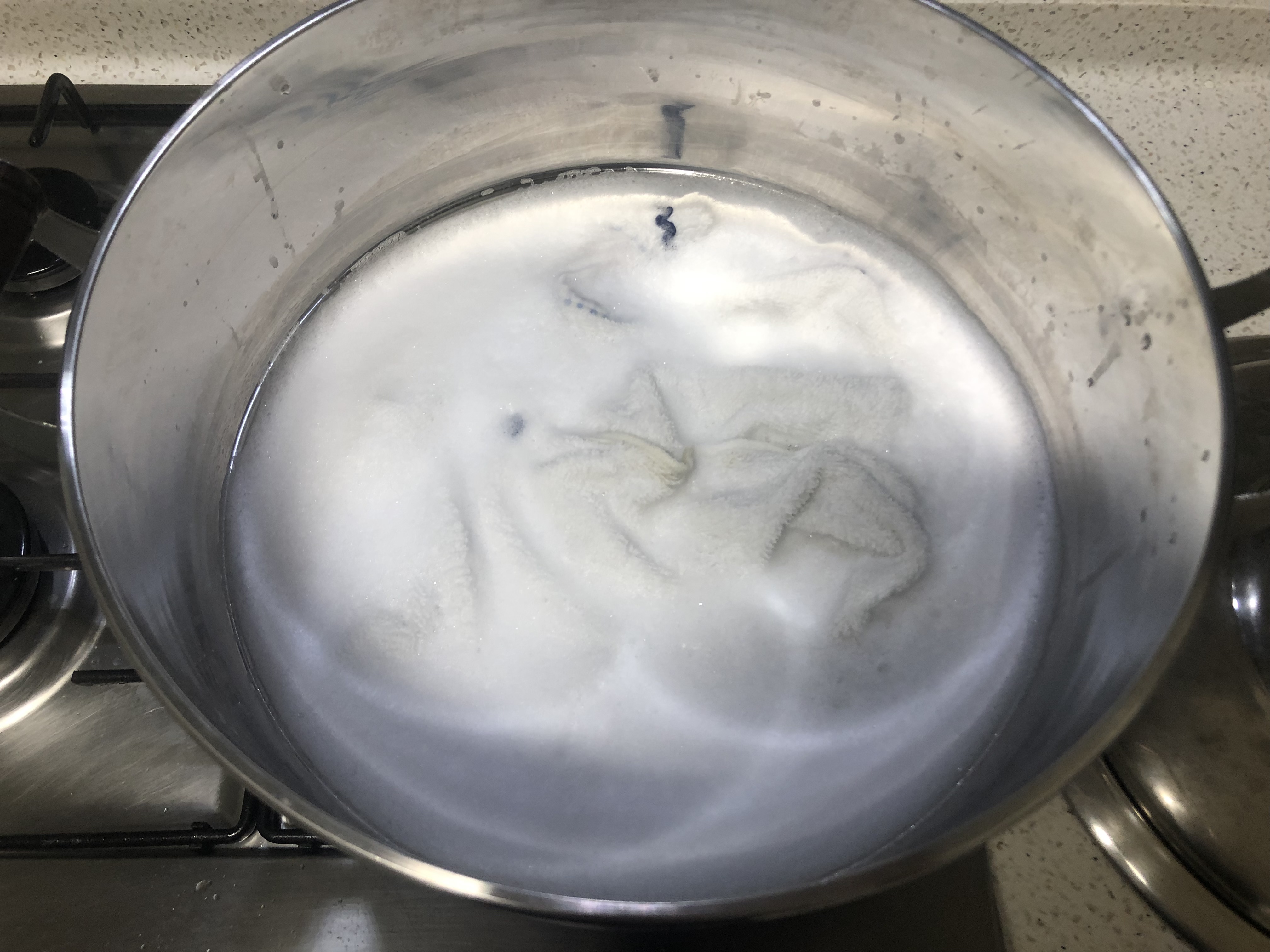 세탁으로 누런 오염이 잘 빠지지 않는 수건을 과탄산소다를 넣고 삶아주었어요. 푹 삶아주고 빨래를 말리면 하얗게 되고 찌든때가 쏙 빠진답니다. :)