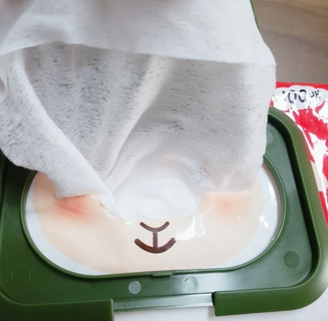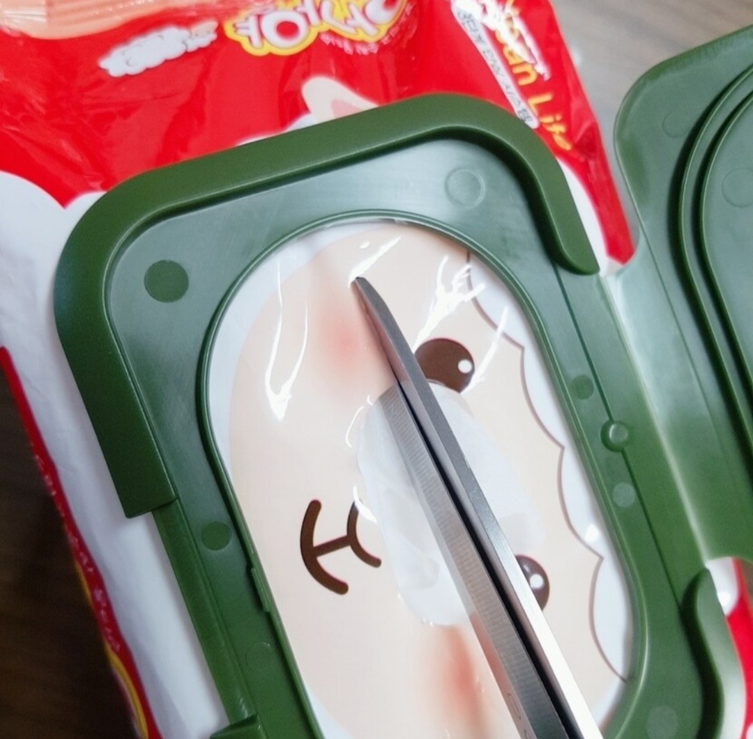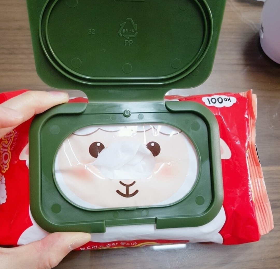 물티슈캡 재활용해서 리필팩에 붙이고, 한장씩 나오게 하려고 입구 양옆을 가위로 잘라줬어요