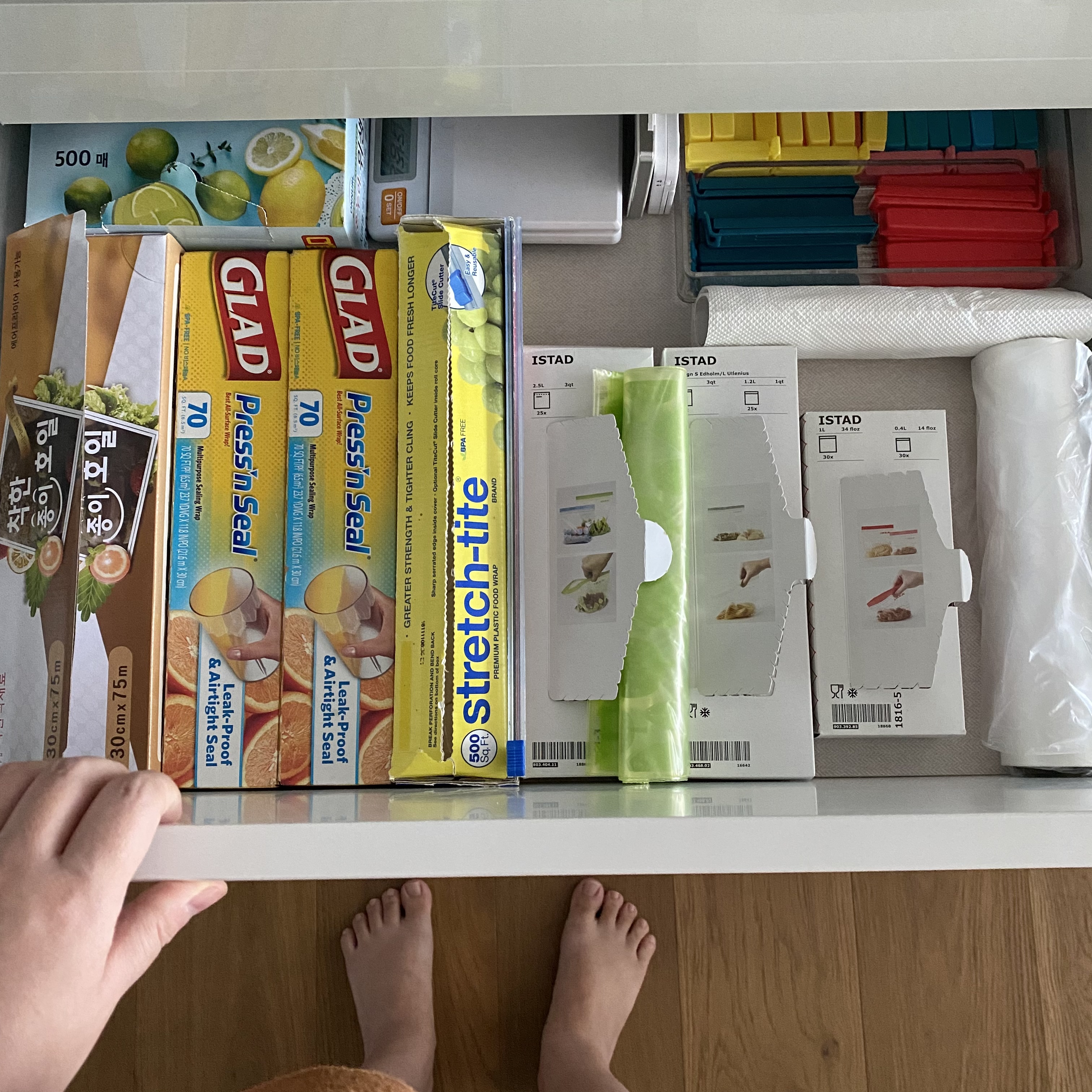 랩이랑 비닐팩등 잡다한 주방용품도 한곳에 모아서 깔끔하게 정리했구요.