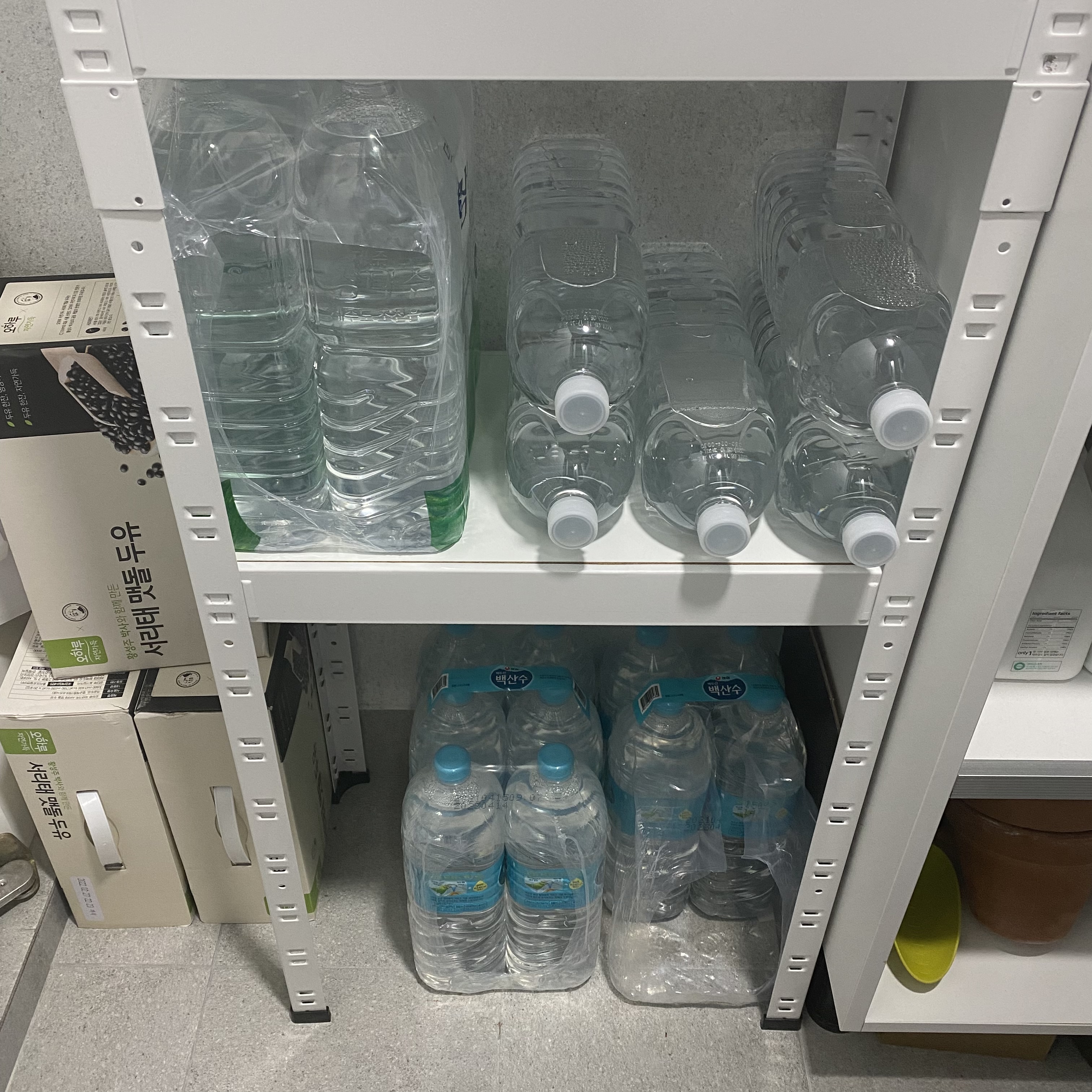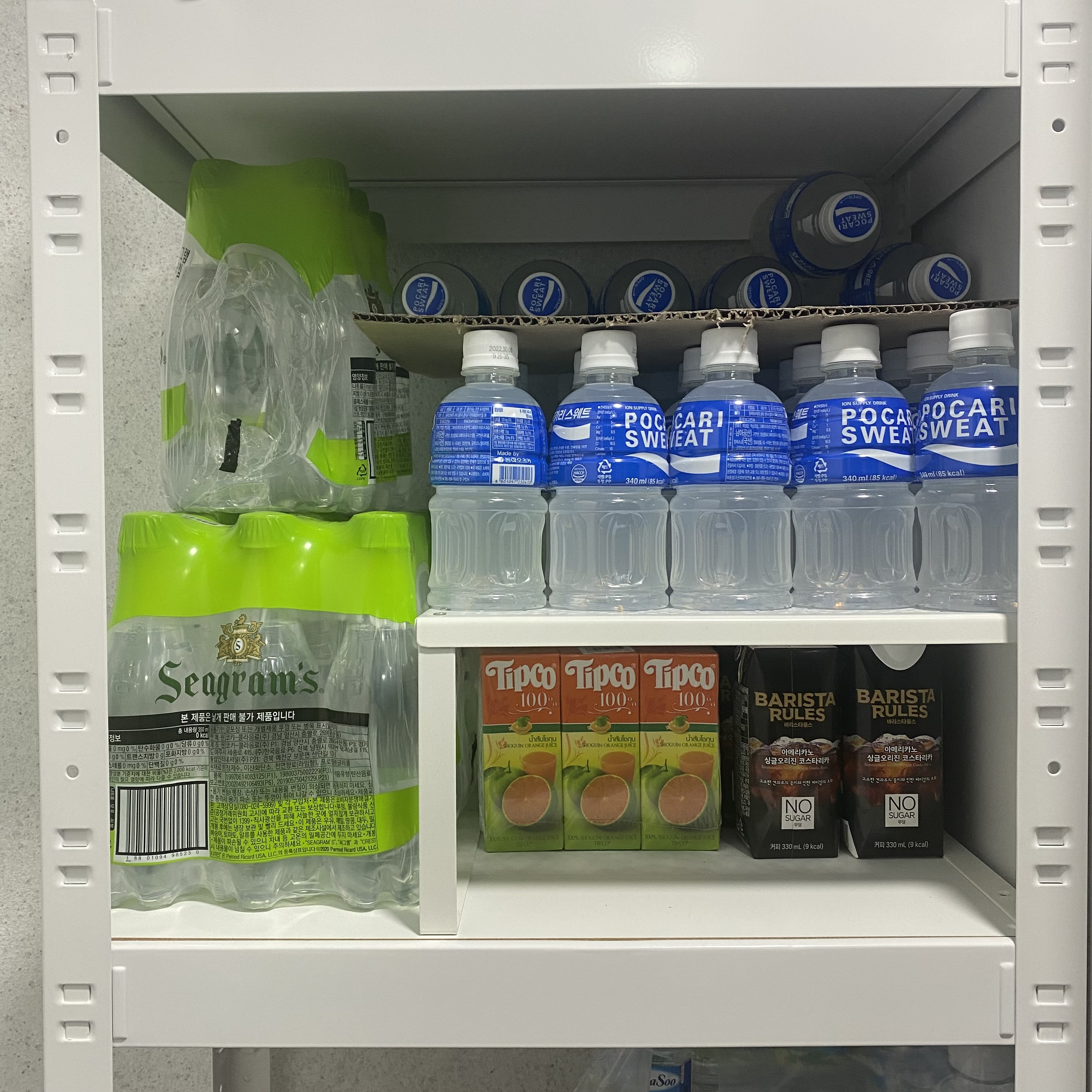 음료를 좋아하는 남편덕분에 베란다에 철제로 보관하는 곳을 따로 만들었어요. 마치 편의점처럼 재고관리하는 재미도 있고 냉장고에 그때그때 채워주면서 음료종류도 바꿔주고 나름 편의점 점장처럼 운영하고 있답니다 : )