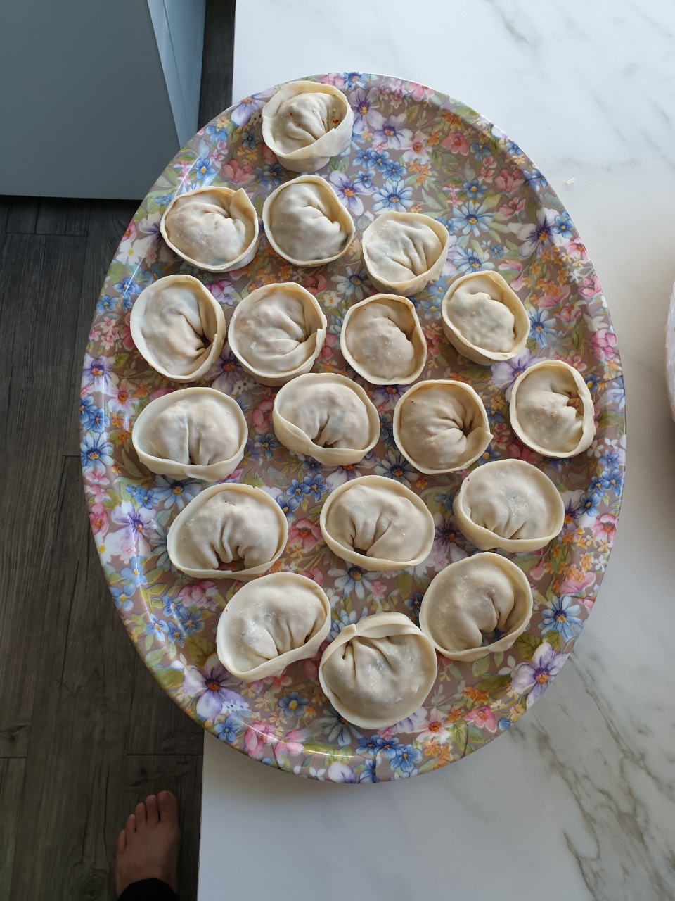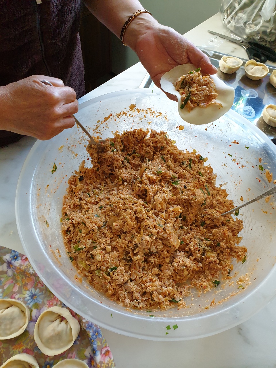 온가족이 모여서 열심히 만두를 빚었어요.