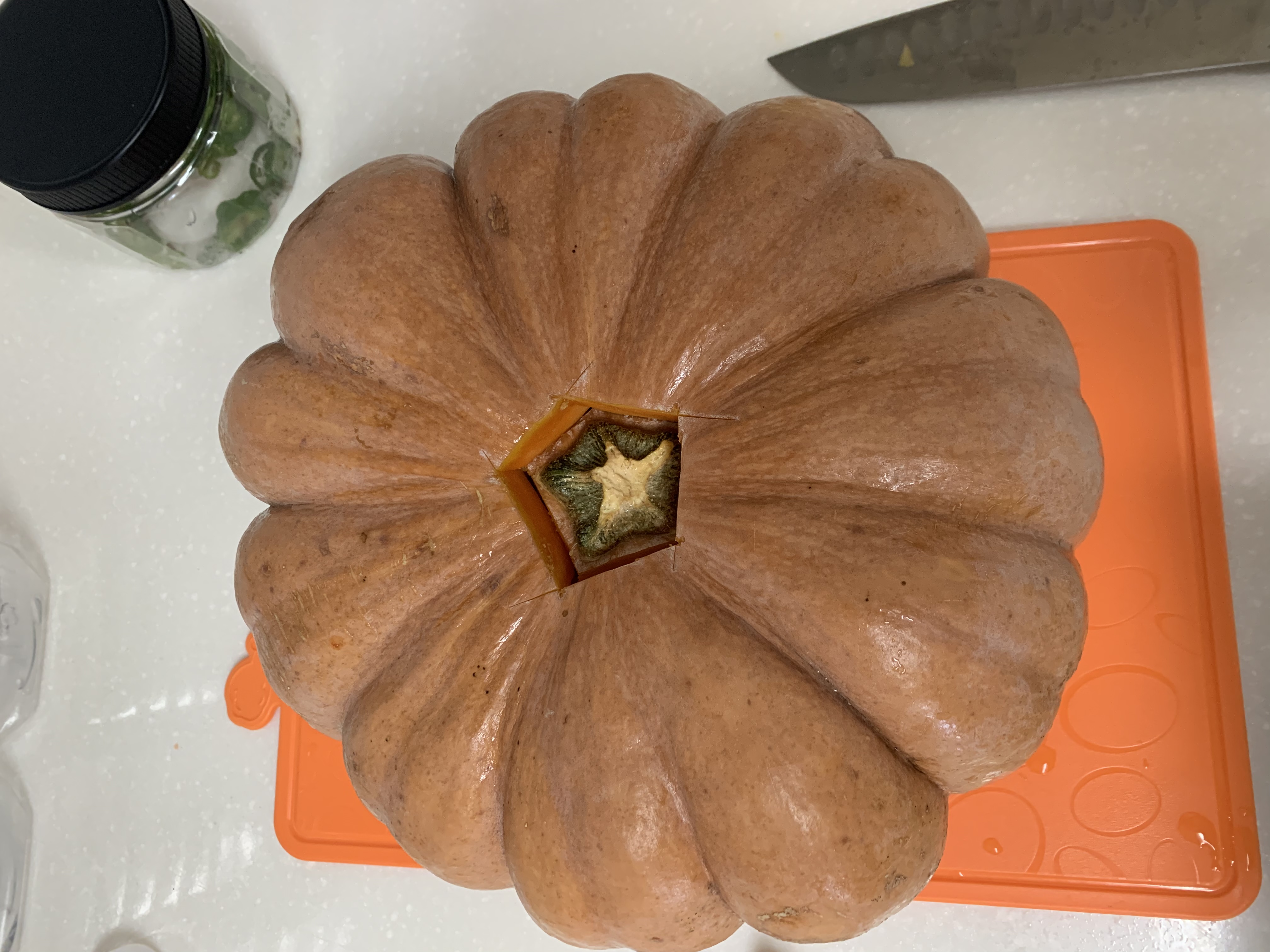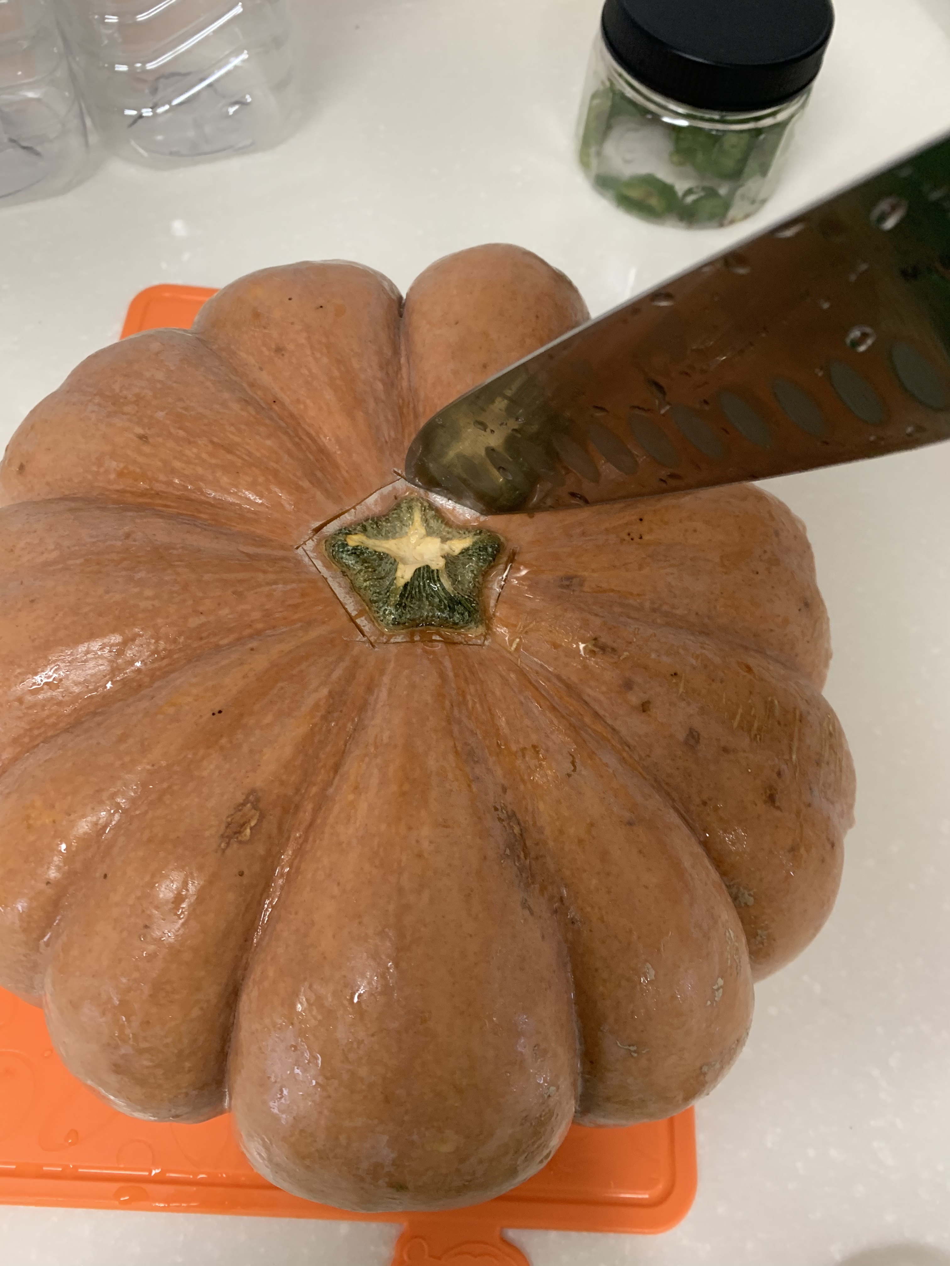 늙은호박 자르기가 쉽지 않은데 꼭지부분을 오각형 모양으로 잘라서 밑으로 꾹 눌러주세요.