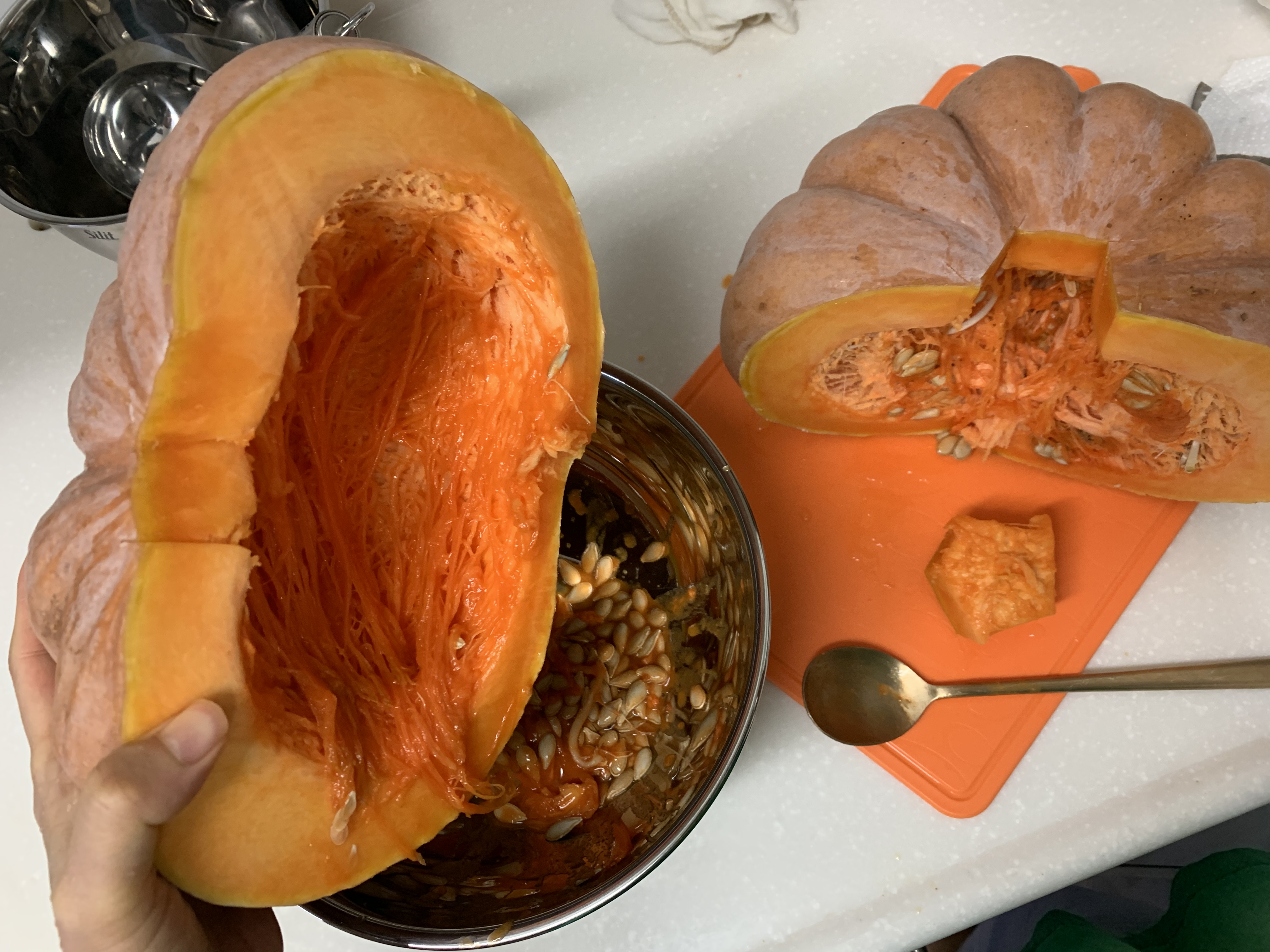숟가락을 이용해서 호박속을 잘 파내주세요. 생각보다 힘있게 긁어야 되더라구요.