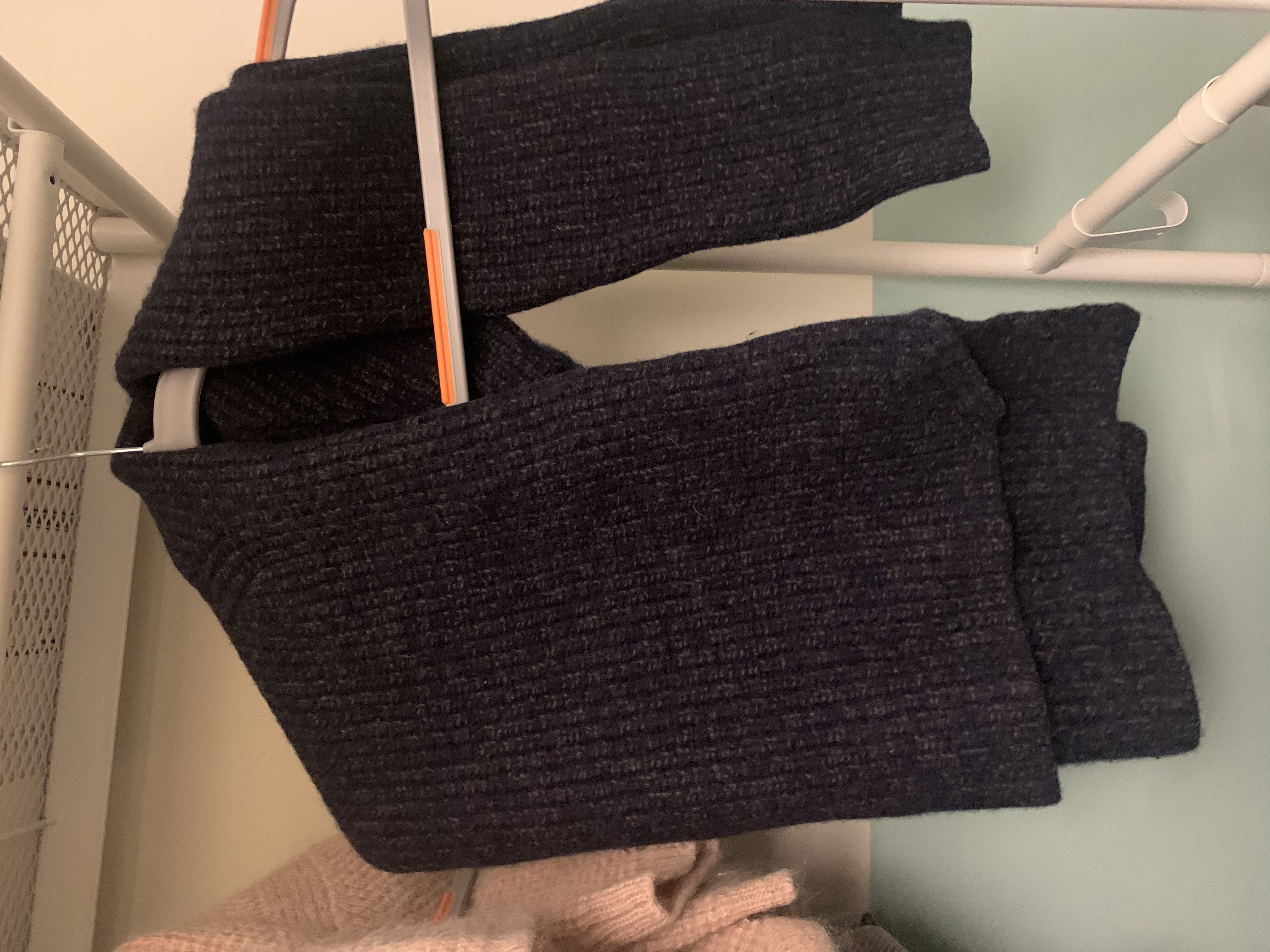 니트를 옷걸이에 걸어두면 어깨에 옷걸이 자국이 남아서 항상 고민스러웠는데, 옷걸이에 접어서 거는 방법으로 옷걸이자국 고민에서 해방되었어요.
