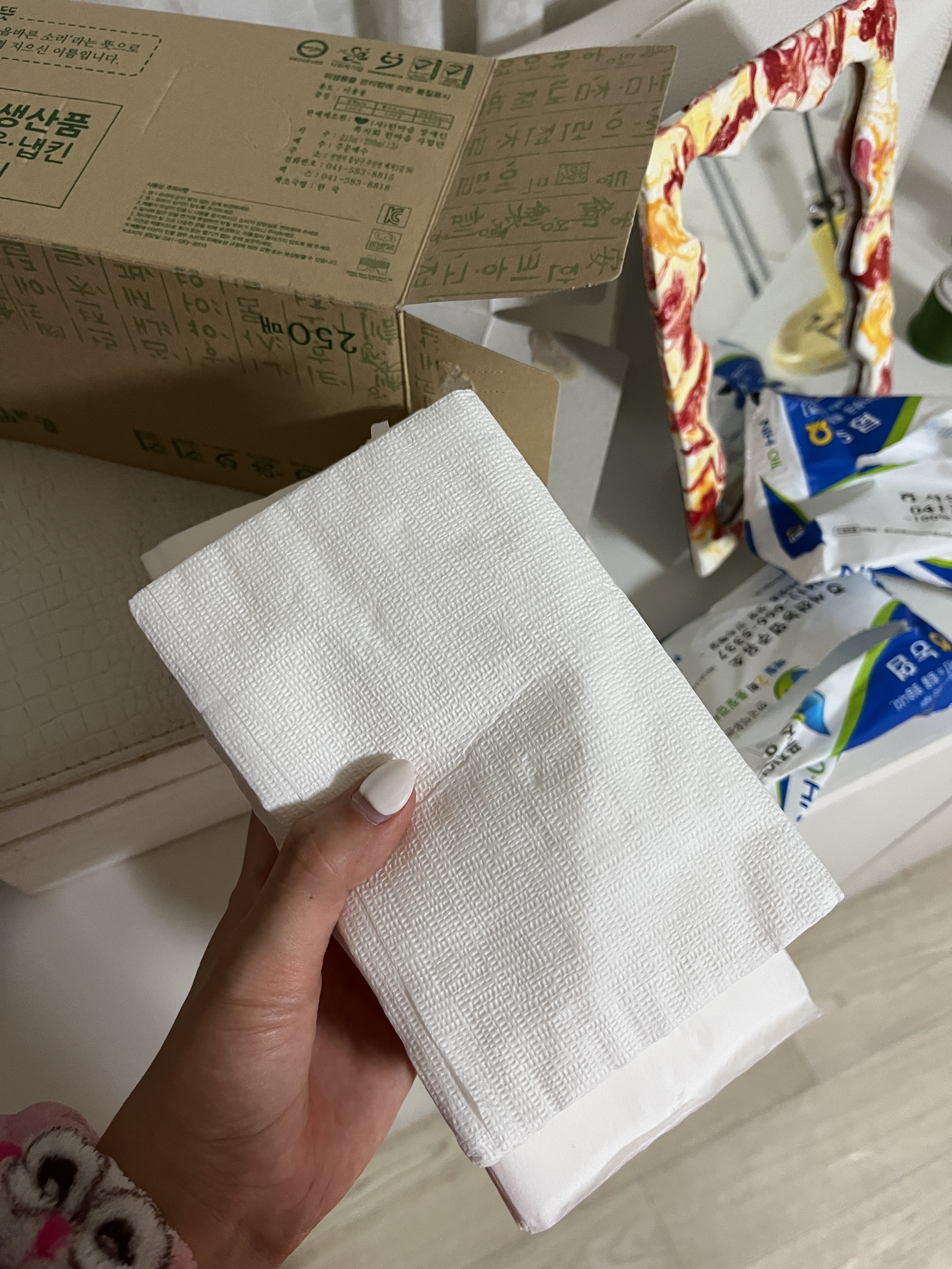 보기 싫은 포장지였는데 깔끔하게 인테리어 해치치 않는 선에서 알뜰하게 미용티슈로 사용할 수 있네요^^