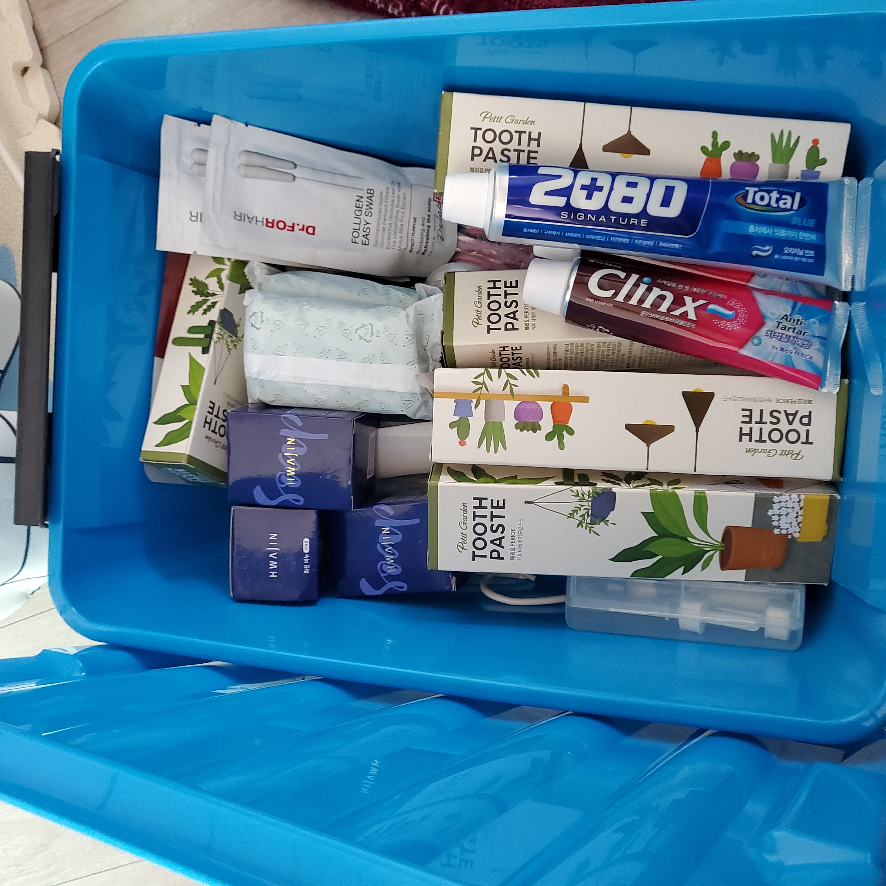 돌아다니는 리빙박스 활용해 선물셋트에 있는 욕실용품 비누 치약등등 정리정돈 해놓고 필요할때마다 꺼내써요