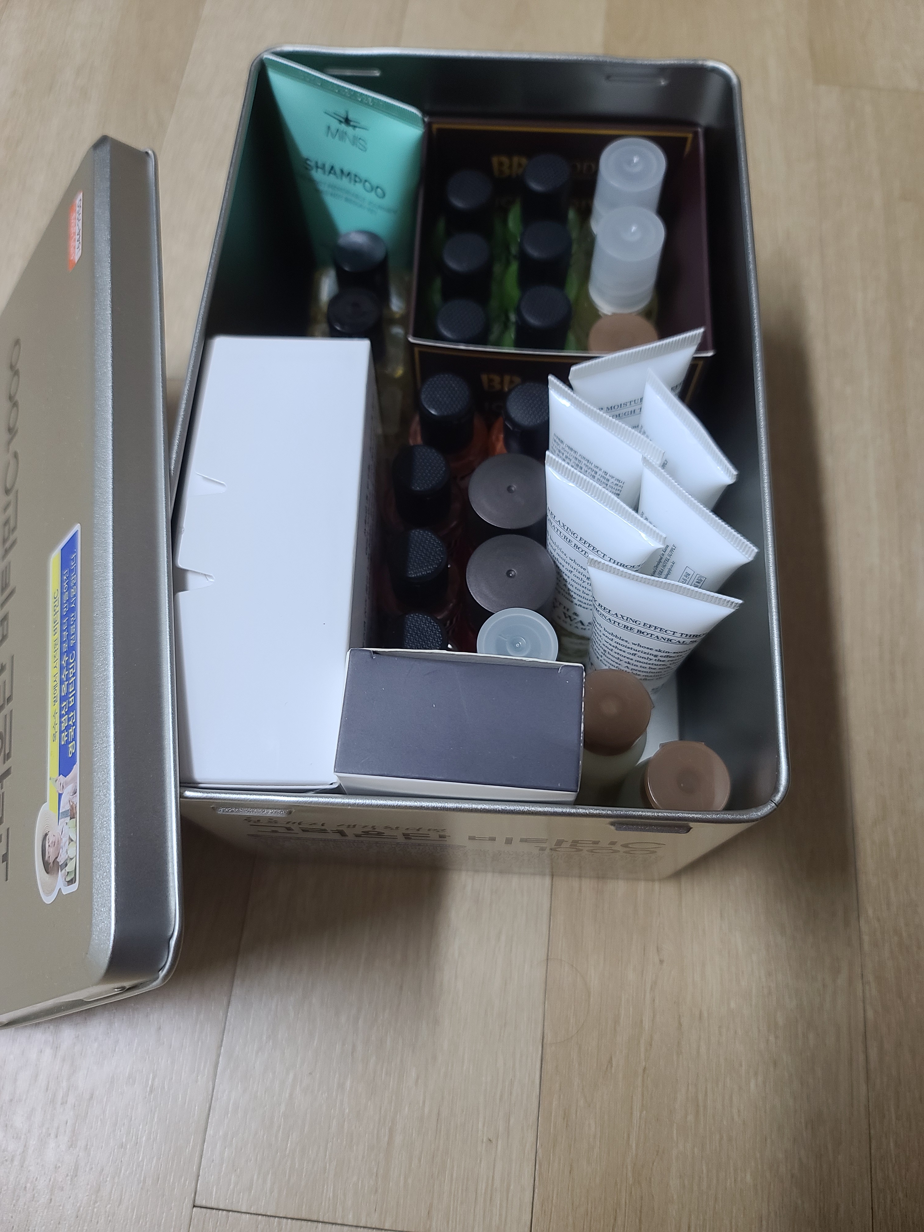 여행 다녀오면 생기는 어메니티를 비타민 양철 상자 안에 넣으니 정리가 되고 찾기도 쉽네요^^