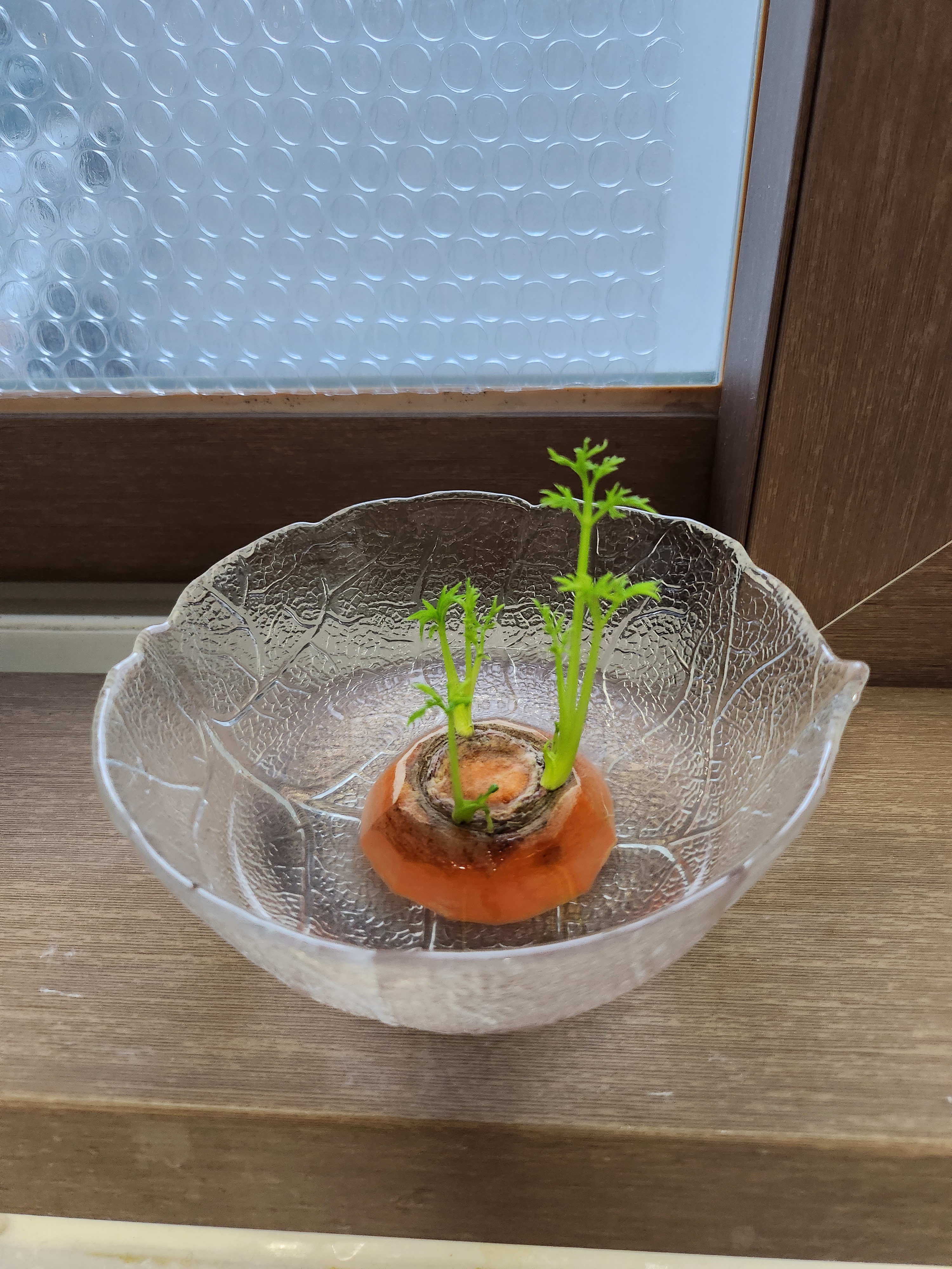 당근뿌리 부분을 물에 담가놓고 열흘 지나니 이만큼 자랐어요