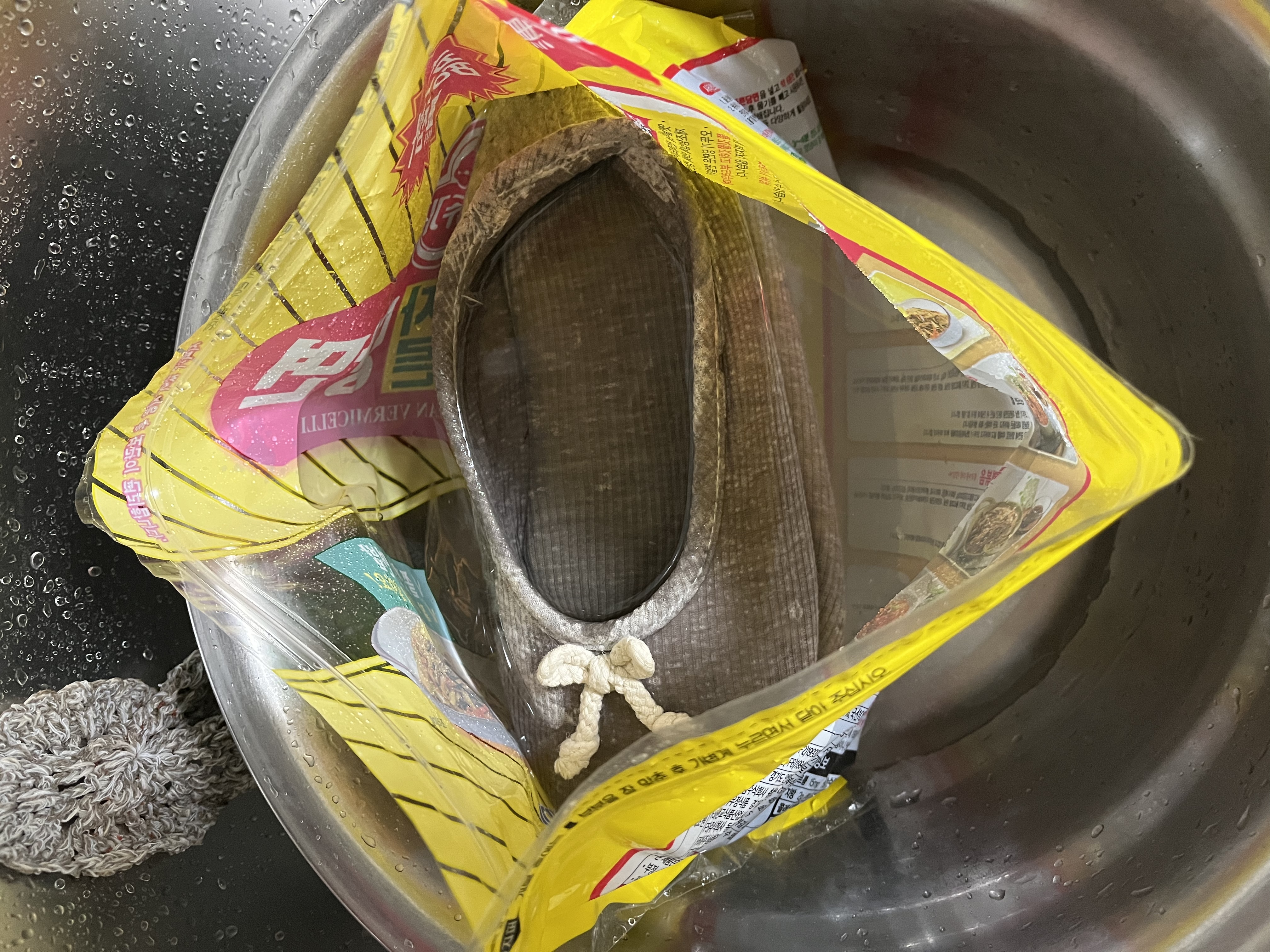 포장재 지퍼백 모았다가 신발 세탁 할때 사용 하면 좋아요 ! 저는 당면 봉투에 물(따뜻하면 좋아요~ )과탄산소다,구연산 한 숟가락 넣고, 실내화 담궈 하룻밤 두었어요.