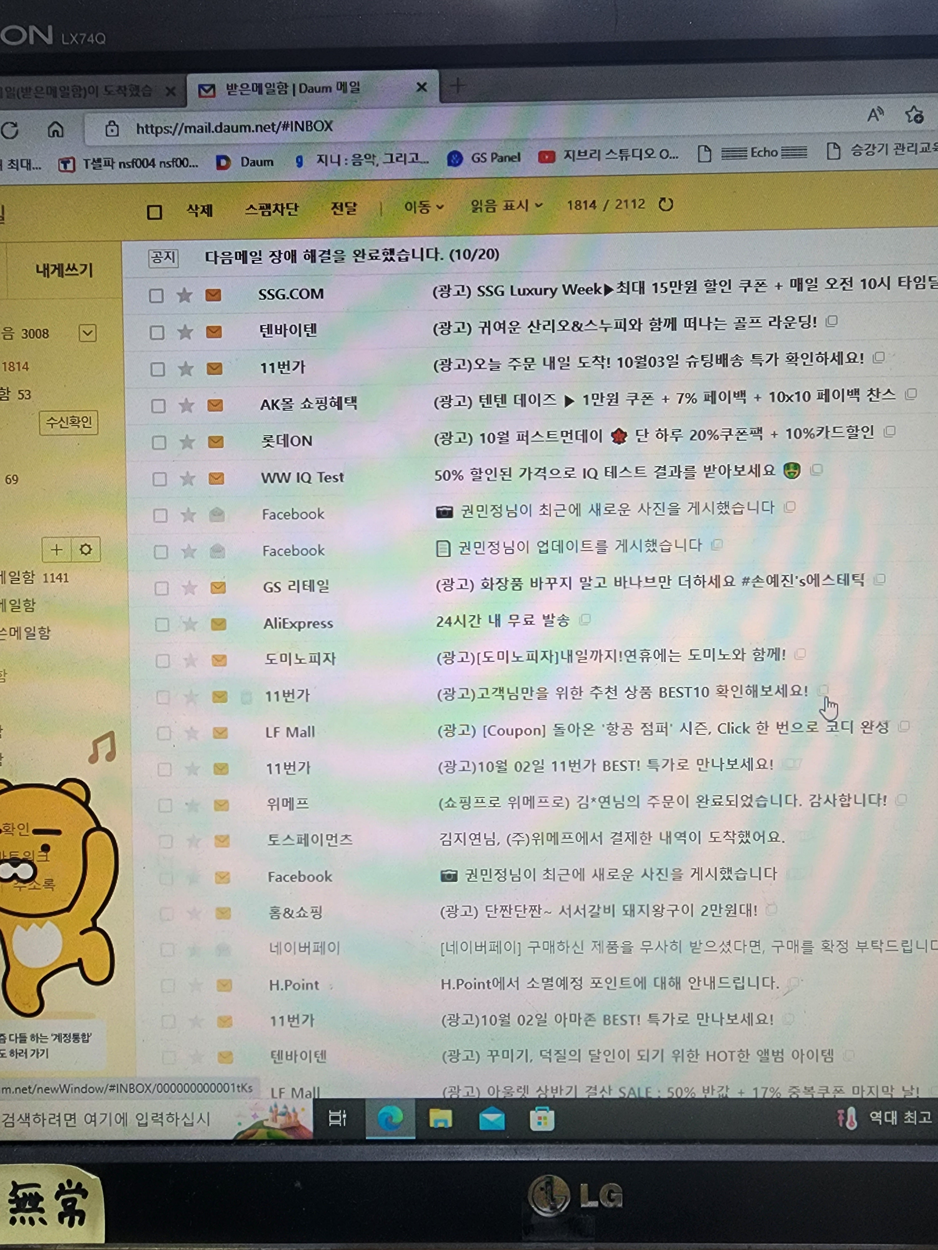 메일함에 들어있는 필요없는 메일만 지워도 에너지 절약이 된다고 해서 메일 지우는중입니다~