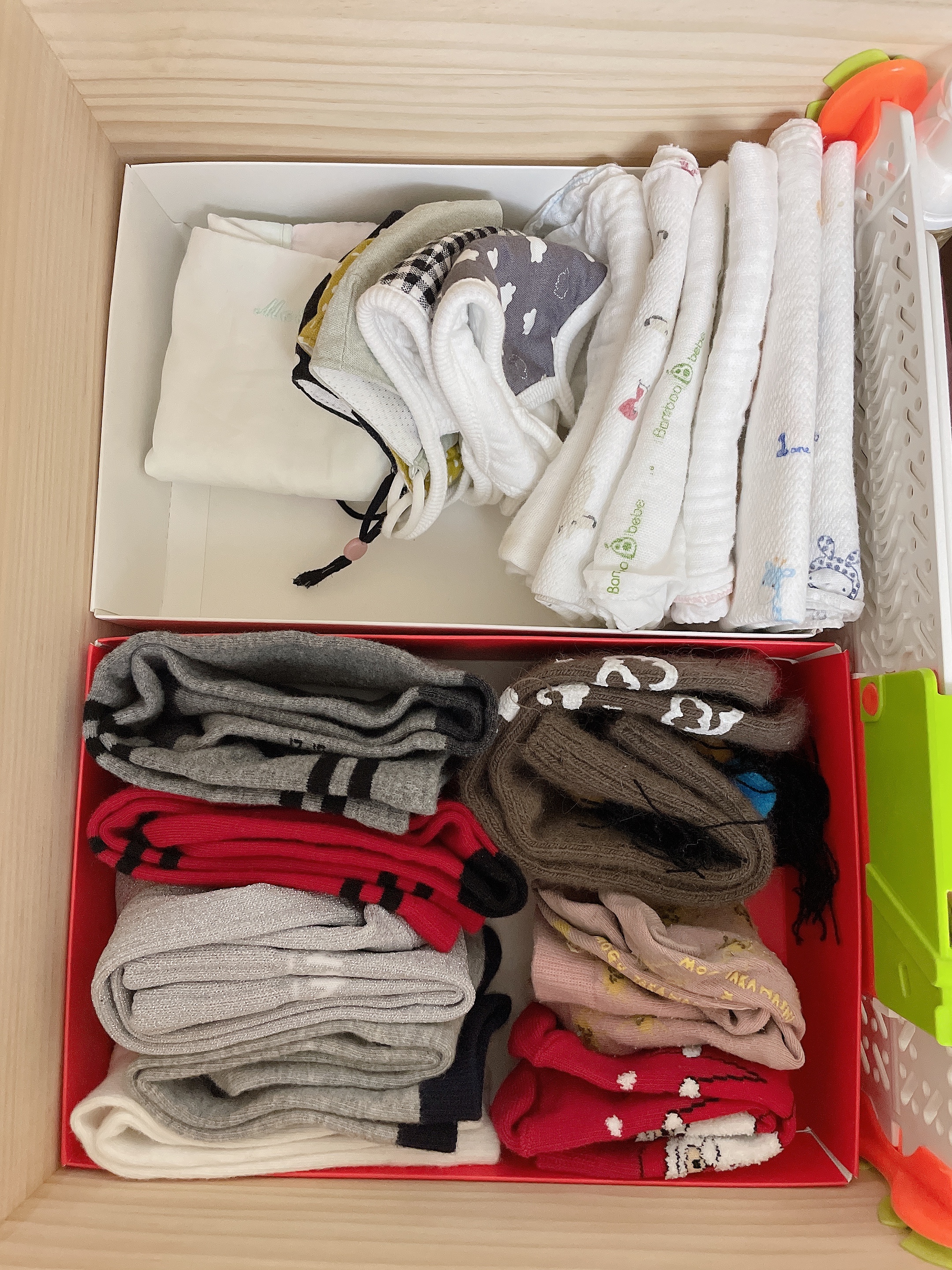 선물이 들어왔는데 상자가 버리기 아까워 어디에 쓸까 고민했는데 마침 아이 서랍장에 사이즈가 딱인거에요.