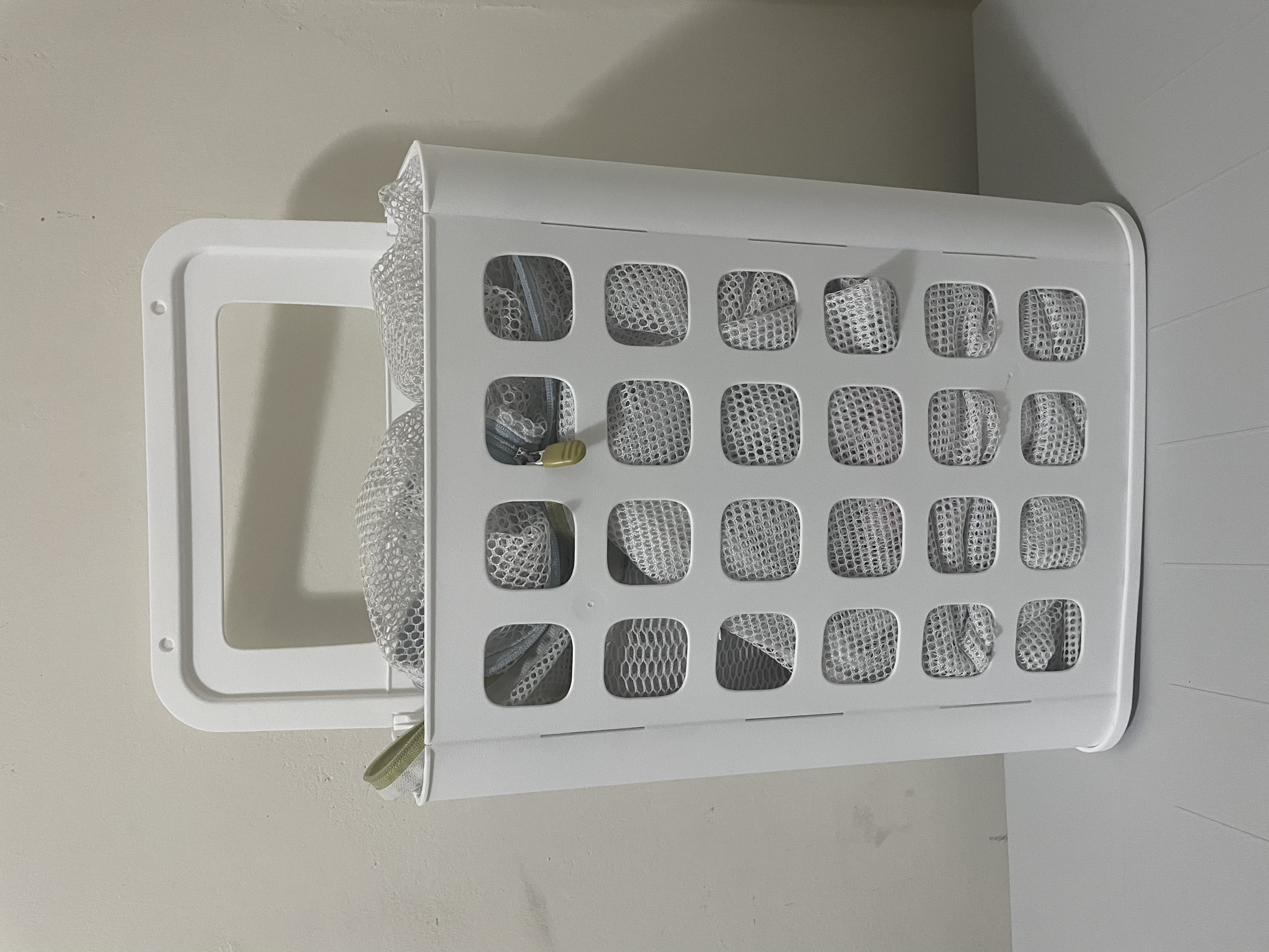 구멍이 있어 통풍도 잘되고 가벼워서 걸어 놓기도 좋은 바구니를 구했어요. 원래 용도는 휴지통이라는데 세탁망 보관하기에 제격이네요. 어디에 걸어둘지 고민중이랍니다 ^^