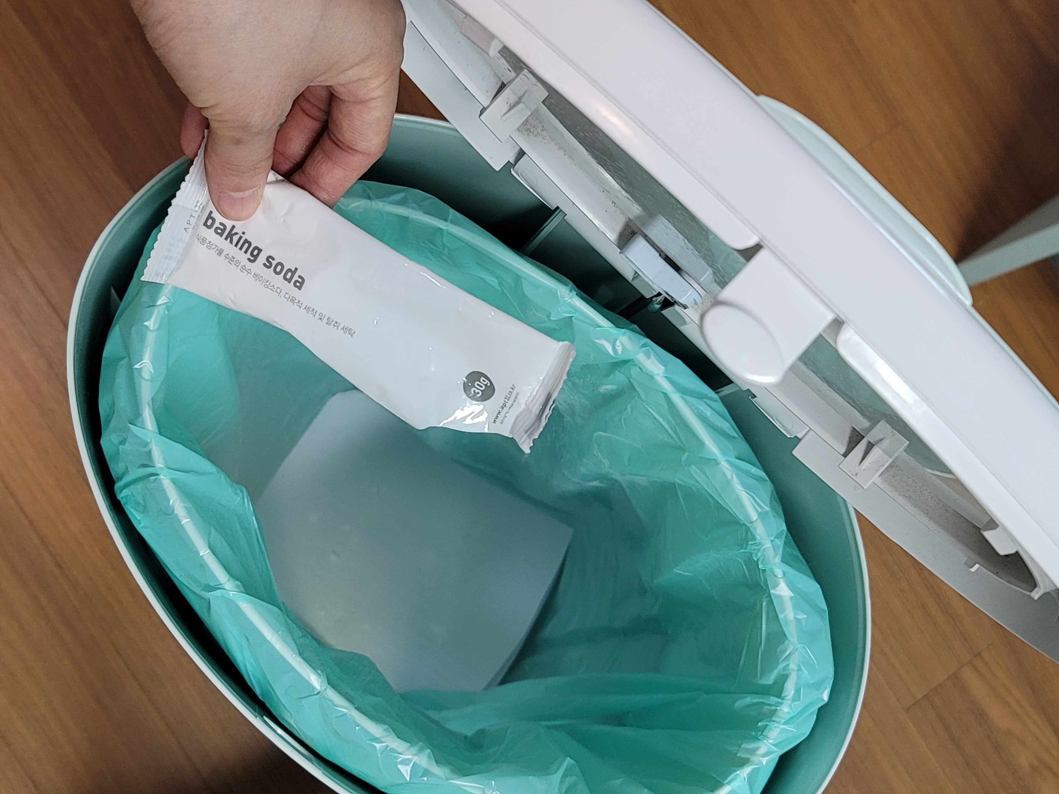 쓰레기통바닥에 종이나신문지깔고 베이킹소다를뿌려두면 악취가중화되는효과가있어요