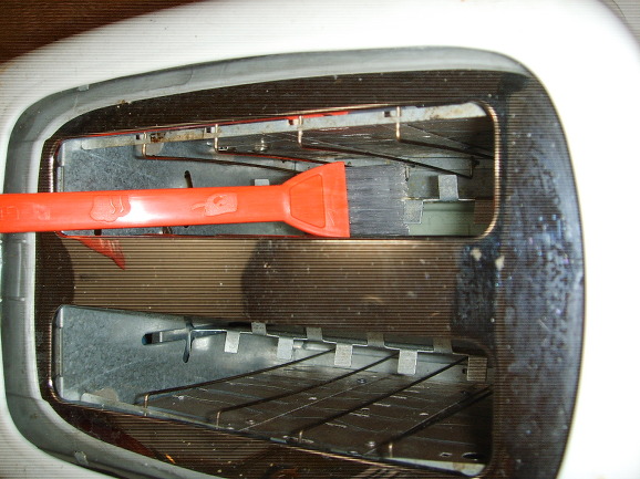 토스터를 뒤집어 빵가루를 떨어뜨린다. 얇은 붓으로 안쪽에 끼인 빵가루를 제거한다. 청소기에 흡입구가 좁은 노즐을 끼우고 접착테이프를 칭칭 감아 노즐에 빨대를 잇는다. ‘빨대 청소기’로 안쪽 나머지 빵가루를 빨아들인다. 받침대는 베이킹소다수를 분무한 뒤 물로 닦는다.