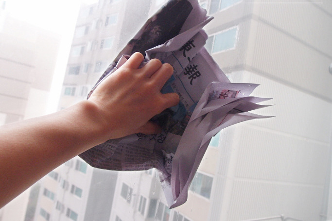 ② 식초수 뿌리면서 신문지로 유리창 전체 닦아주기