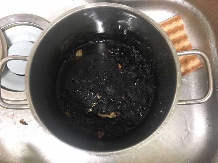 냄비 안의 음식물이 타서 눌어붙었을 때는