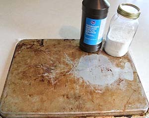 종이컵 4분의 1컵 분량의 베이킹 소다와 과산화수소를 섞어서 반죽을 만들어 쿠키 시트와 굽기용 팬을 손으로 문질러 고루 발라주세요.