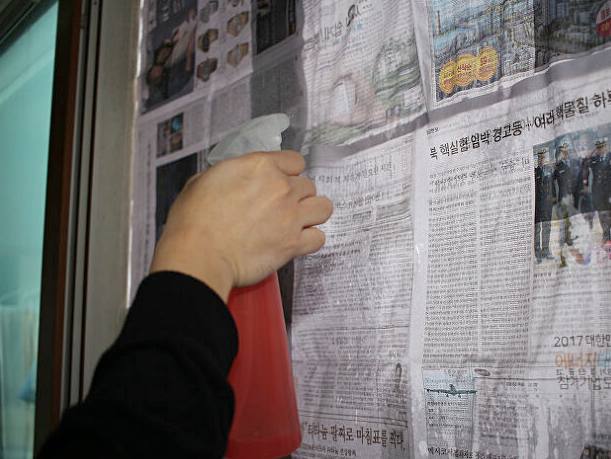 ① 방충망에 신문지를 대고 반대편에 분무기로 미지근한 물을 뿌린다.