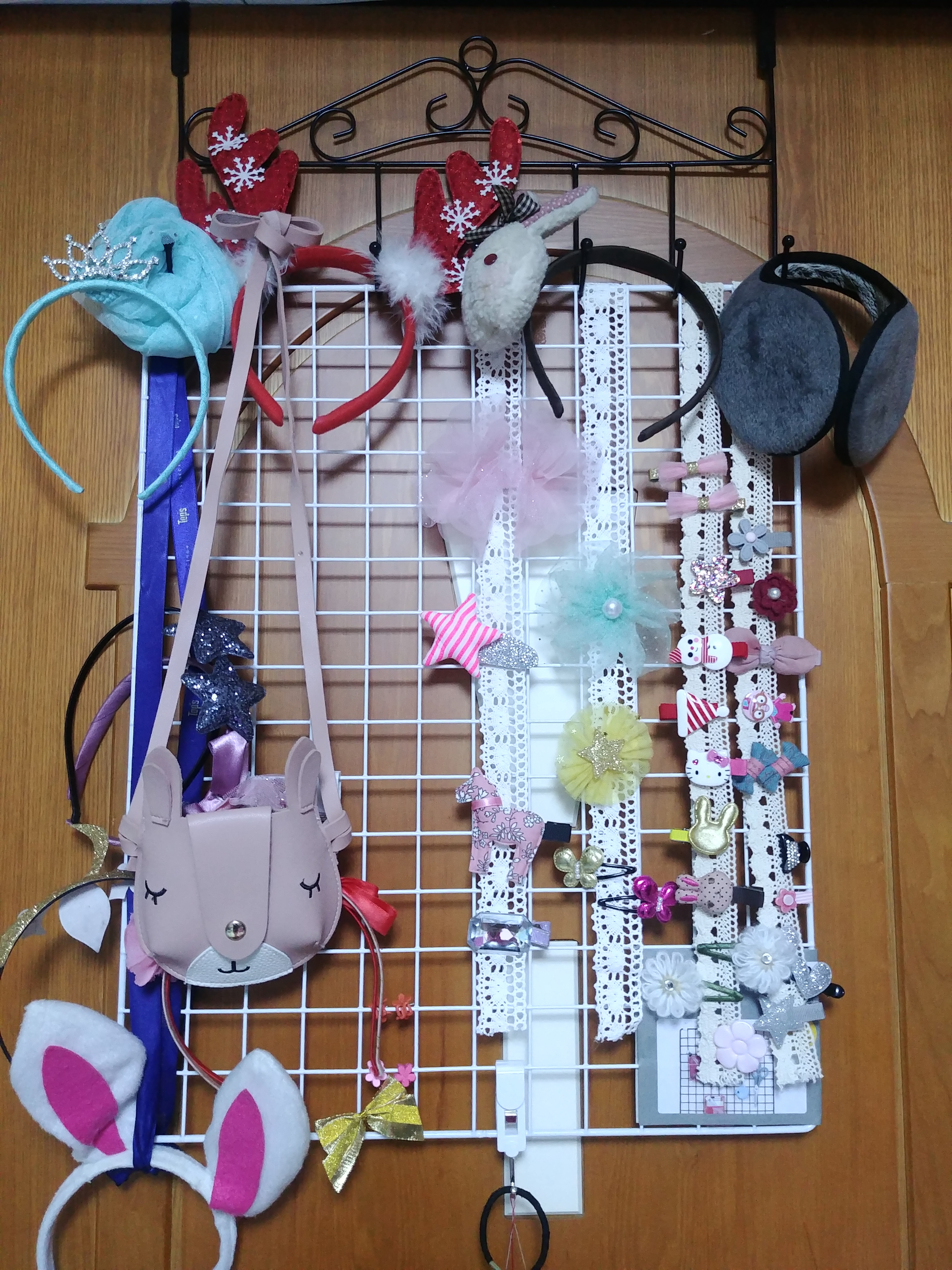 여자아이는 머리핀이 넘쳐나고 상자나 보관함에 넣어두면 한눈에 안보여 찾기가 힘들었어요. 문에 거는 옷걸이와 다이소 철망, 끈, 글루건으로 정리대를 만들어 쓰고 있는데 한눈에 보이니 시간이 훨씬 절약됩니다