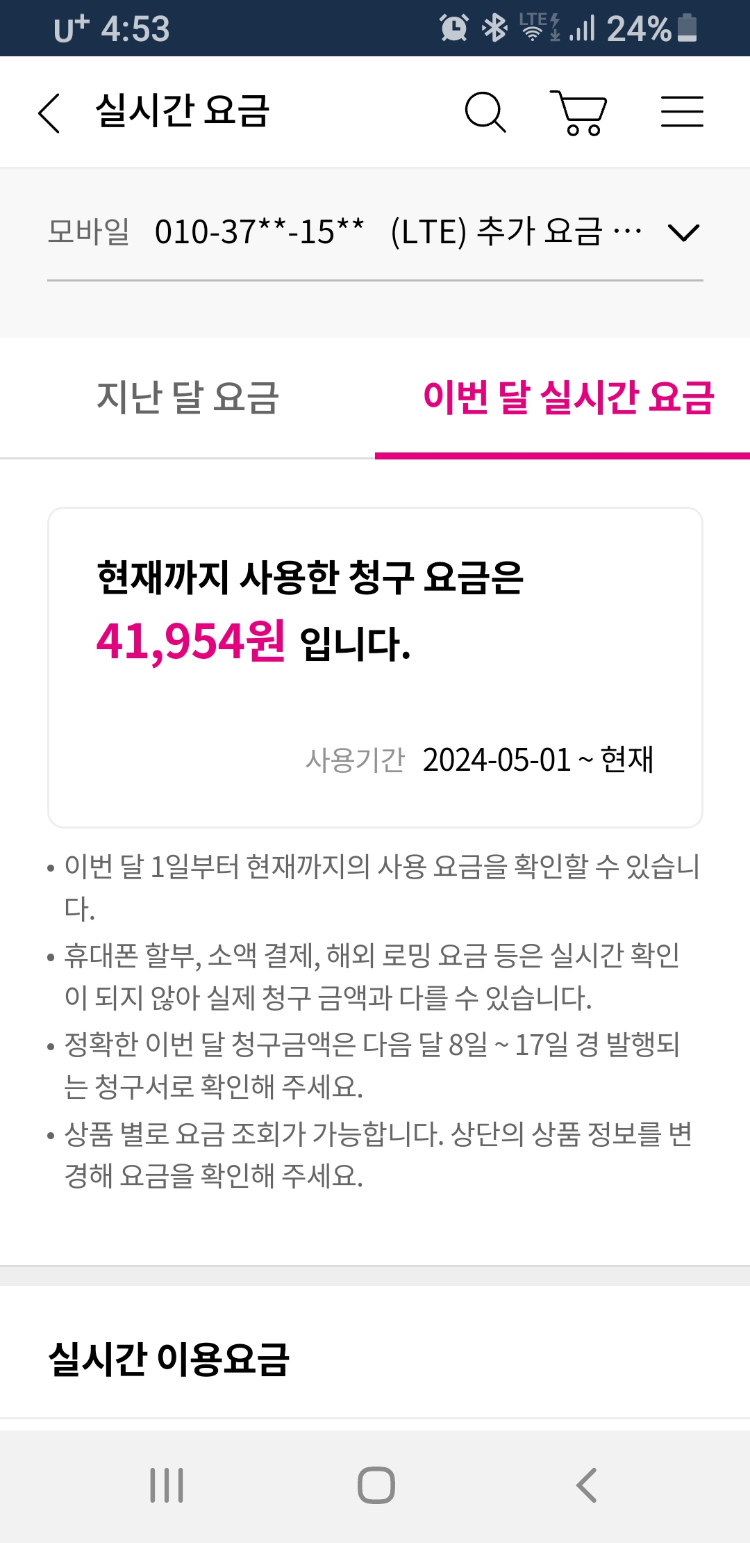 실시간 핸드폰 요금
