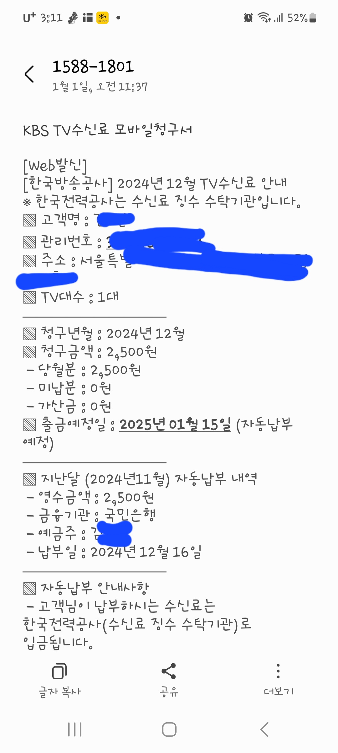 도시가스. 티비수신료 모바일요금게산서