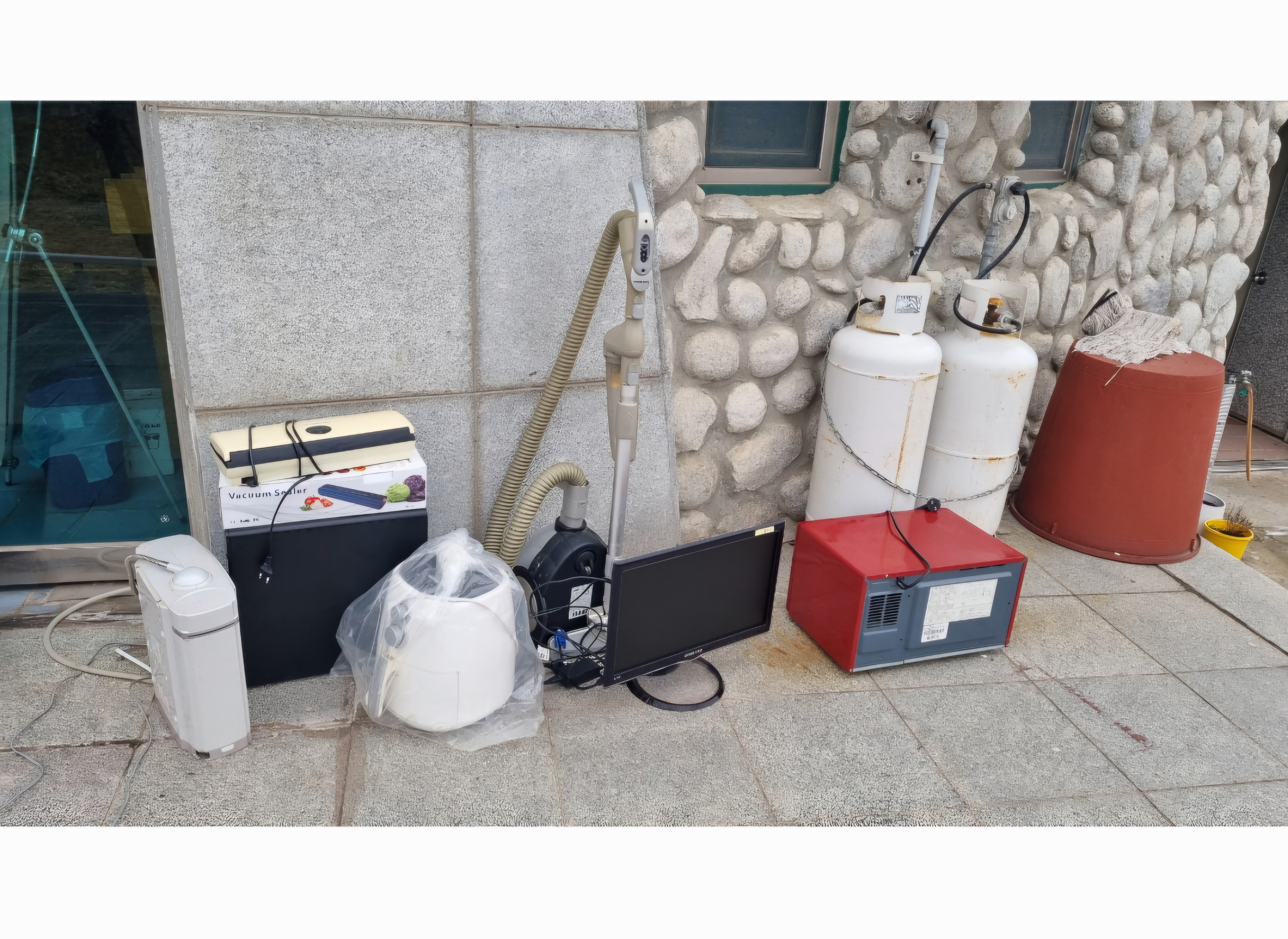 이온수기, 식품압축기2개, 에어프라이기, pc세트,전자레인지,청소기. 총7개